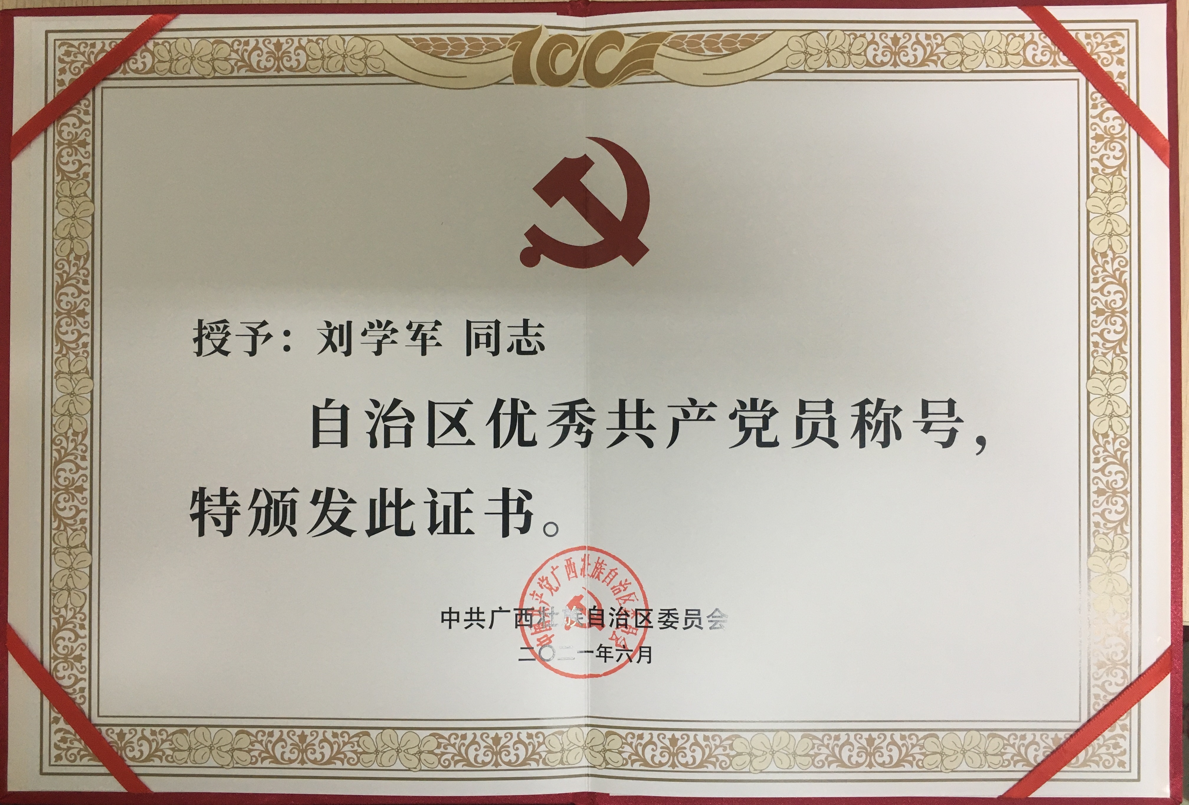 据悉,在庆祝建党100周年的重要时刻,为表彰先进、鼓舞士气、振奋人心,激励广大党员和各级党组织不忘初心、牢记使命,开拓奋进、砥砺前行,奋力推动全区经济社会高质量发展,自治区党委决定,对徐华等200名共产党员、毛鑫等150名党务工作者、马山县金钗镇龙印村党支部等300个基层党组织予以表彰,分别授予“自治区优秀共产党员”、“自治区优秀党务工作者”、“自治区先进基层党组织”称号。