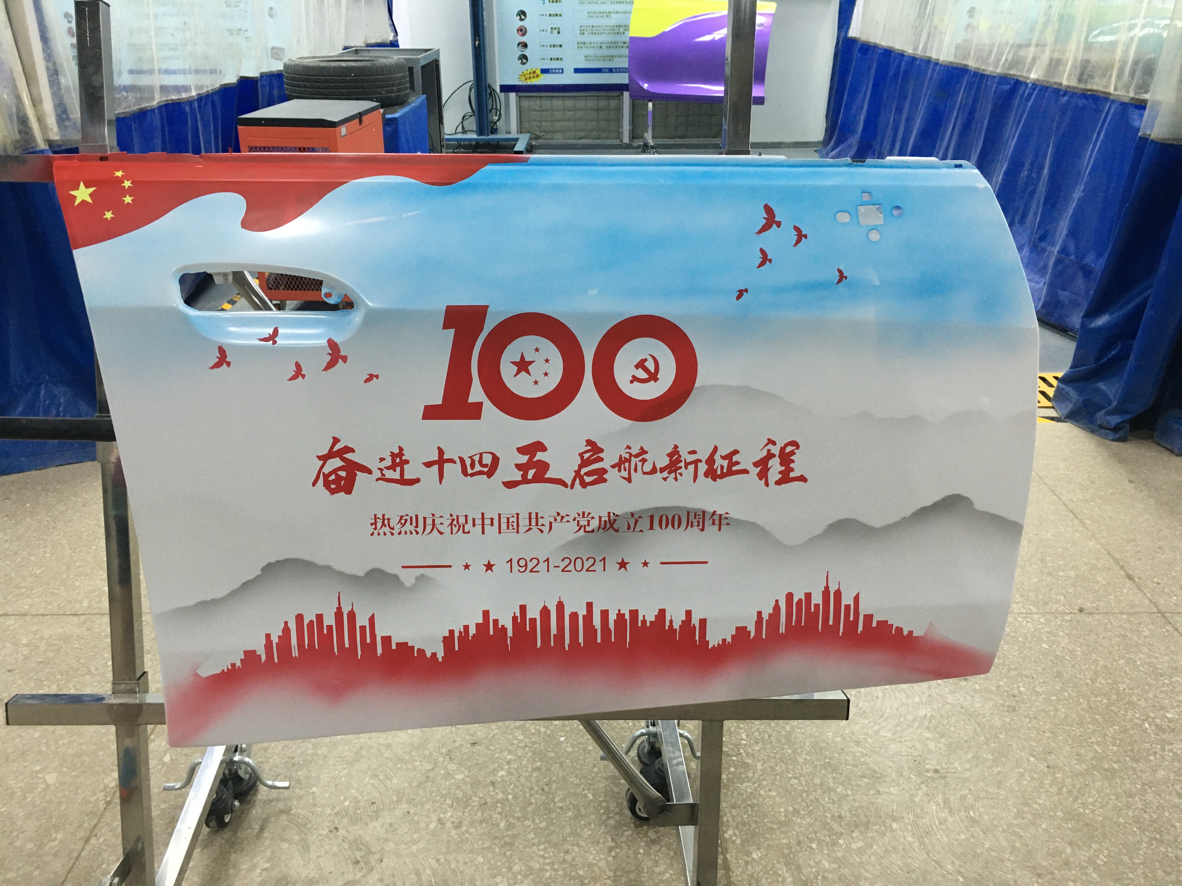 “学习红色革命精神内涵,结合专业技能,利用喷枪,用心倾注,把理解的精神喷到汽车门板上。在制作过程中,深入了解建党100年周年的光辉历史,增强了师生爱国主义情怀。”全国交通技术能手、车身教研室主任夏明表示。