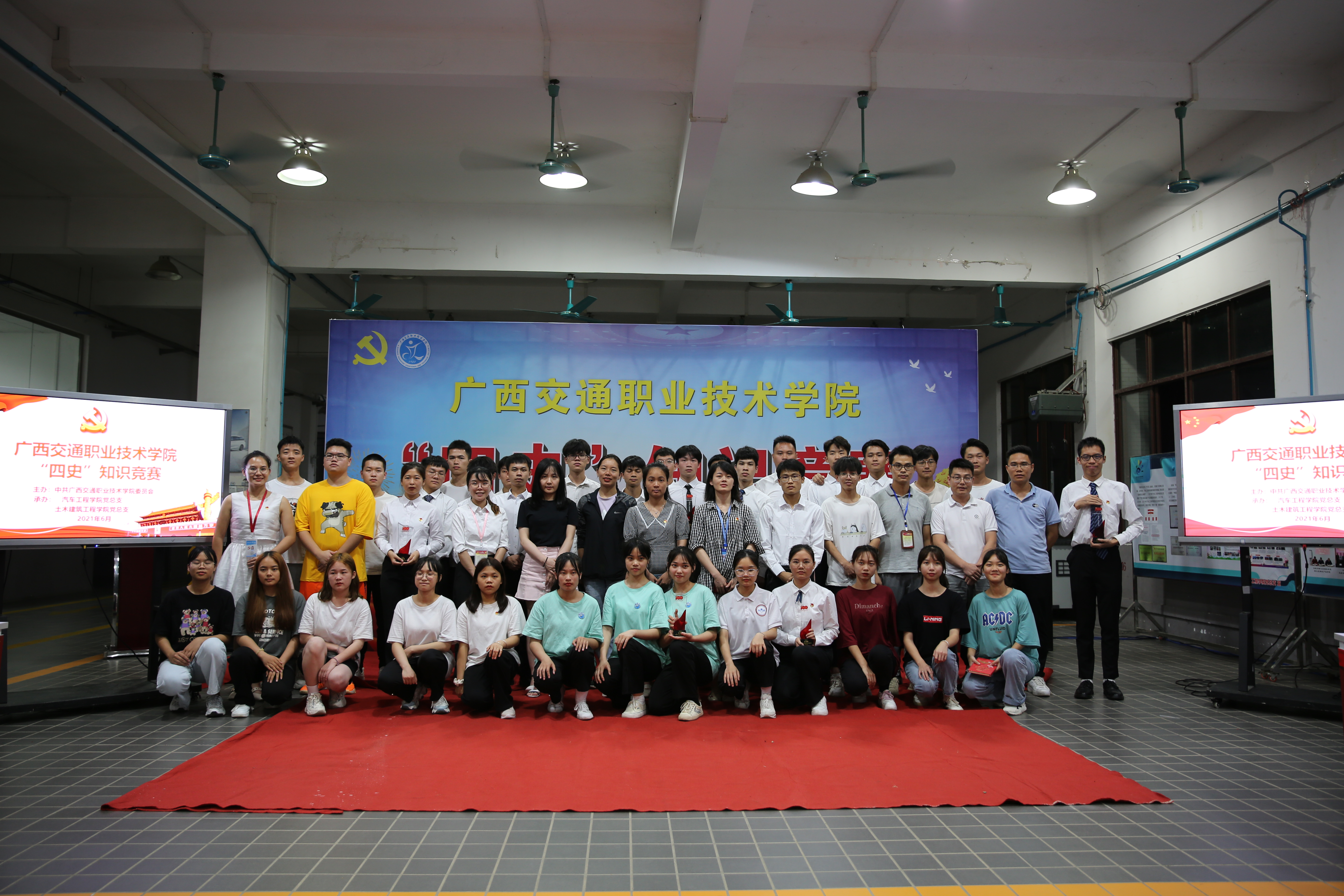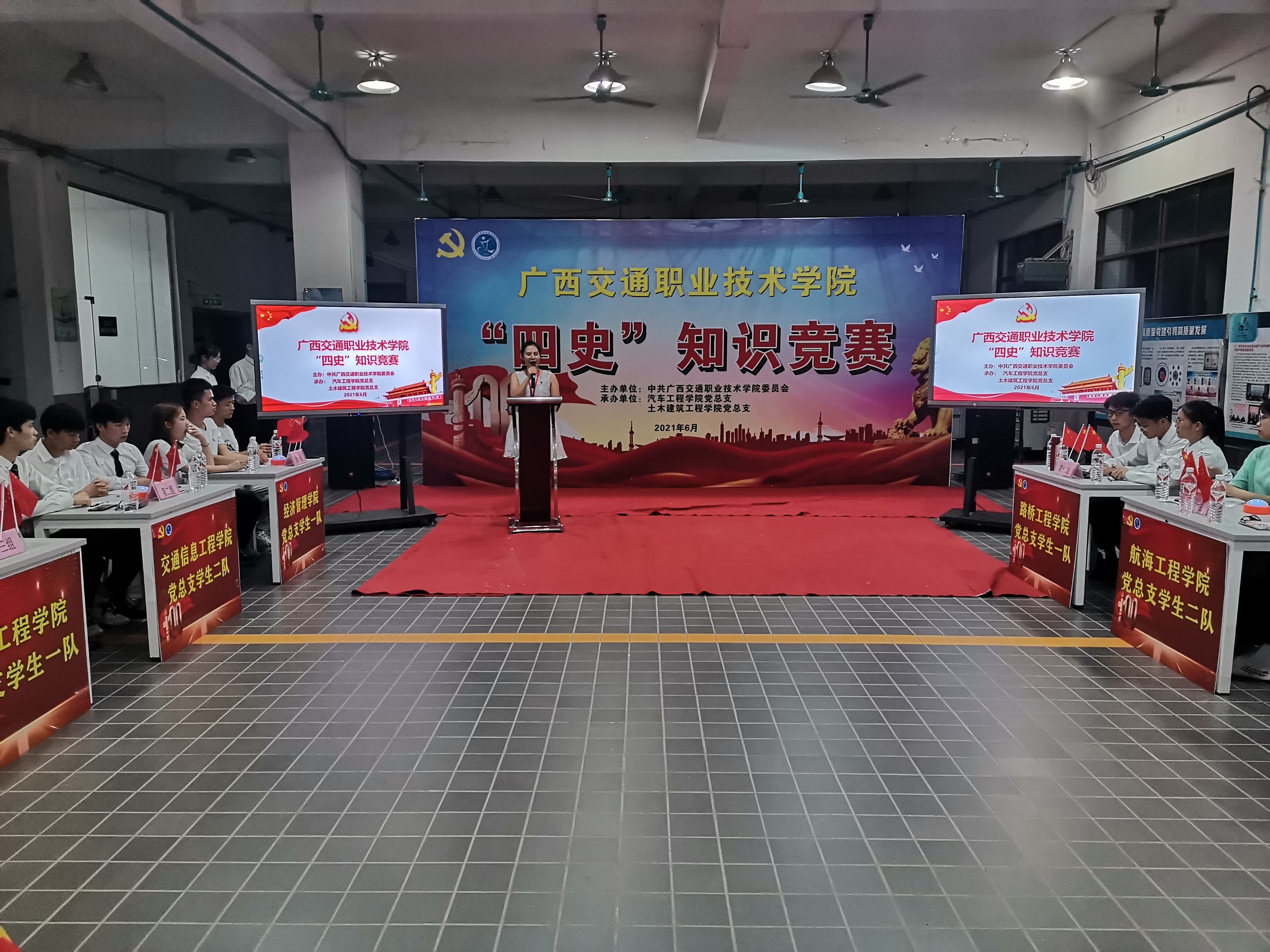(汽车工程学院 讯 唐星华、王杰身 刘凤鸣/文)2021年6月1日,由汽车工程学院党总支和土木建筑工程学院党总支共同承办的广西交通之职业技术学院“四史”知识竞赛学生组比赛在汽车楼二楼举办。经各二级学院党总支进行初赛后,推选出的12支优秀参赛队参加比赛。整个比赛竞彩纷呈,赢得场下观众的阵阵掌声,场下观众也通过观众抢答题弥补了不能上场的遗憾,充分调动学生把“四史”知识装进脑袋,刻进灵魂的积极性。