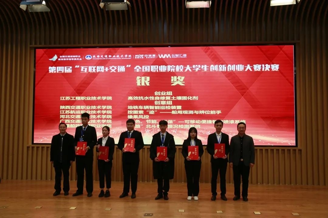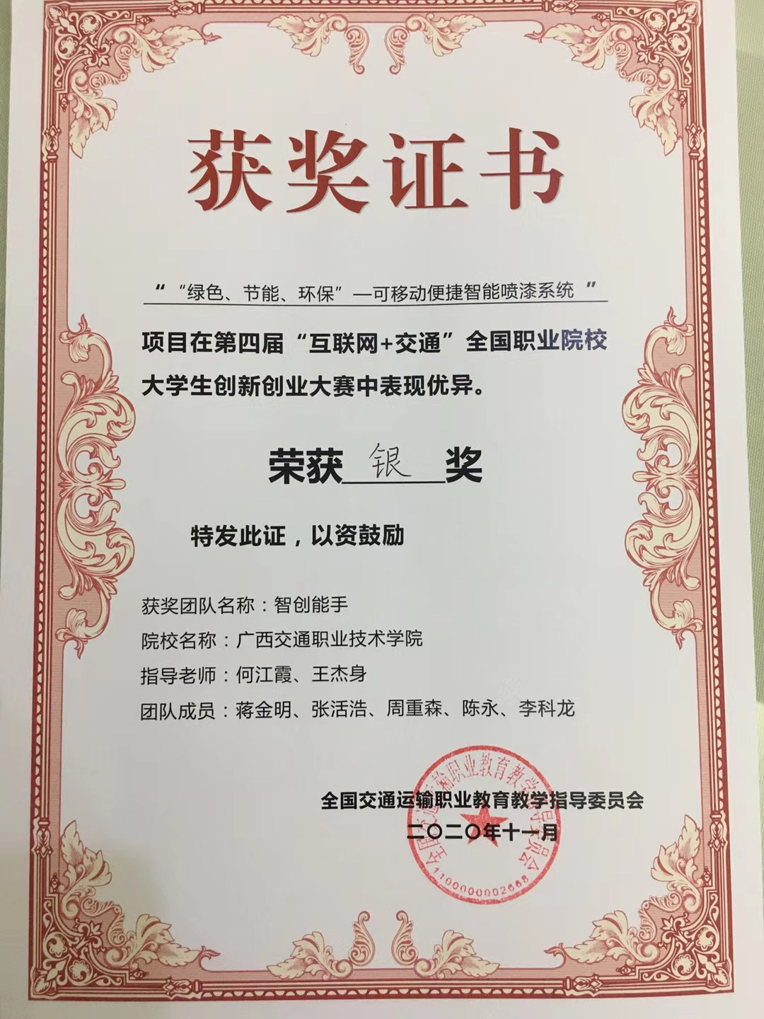 (汽车工程学院 讯 梁业灿/文 王杰身/图)11月27日至28日,由全国交通运输职业教育教学指导委员会主办的第四届“互联网+交通”全国交通运输职业院校创新创业大赛决赛在陕西交通职业技术学院举行。汽车工程学院学生王蒋金明、张活浩、周重森、陈永、李科龙,在何江霞、王杰身老师指导下参赛的““绿色、节能、环保”—可移动便捷智能喷漆系统”项目夺得全国银奖;