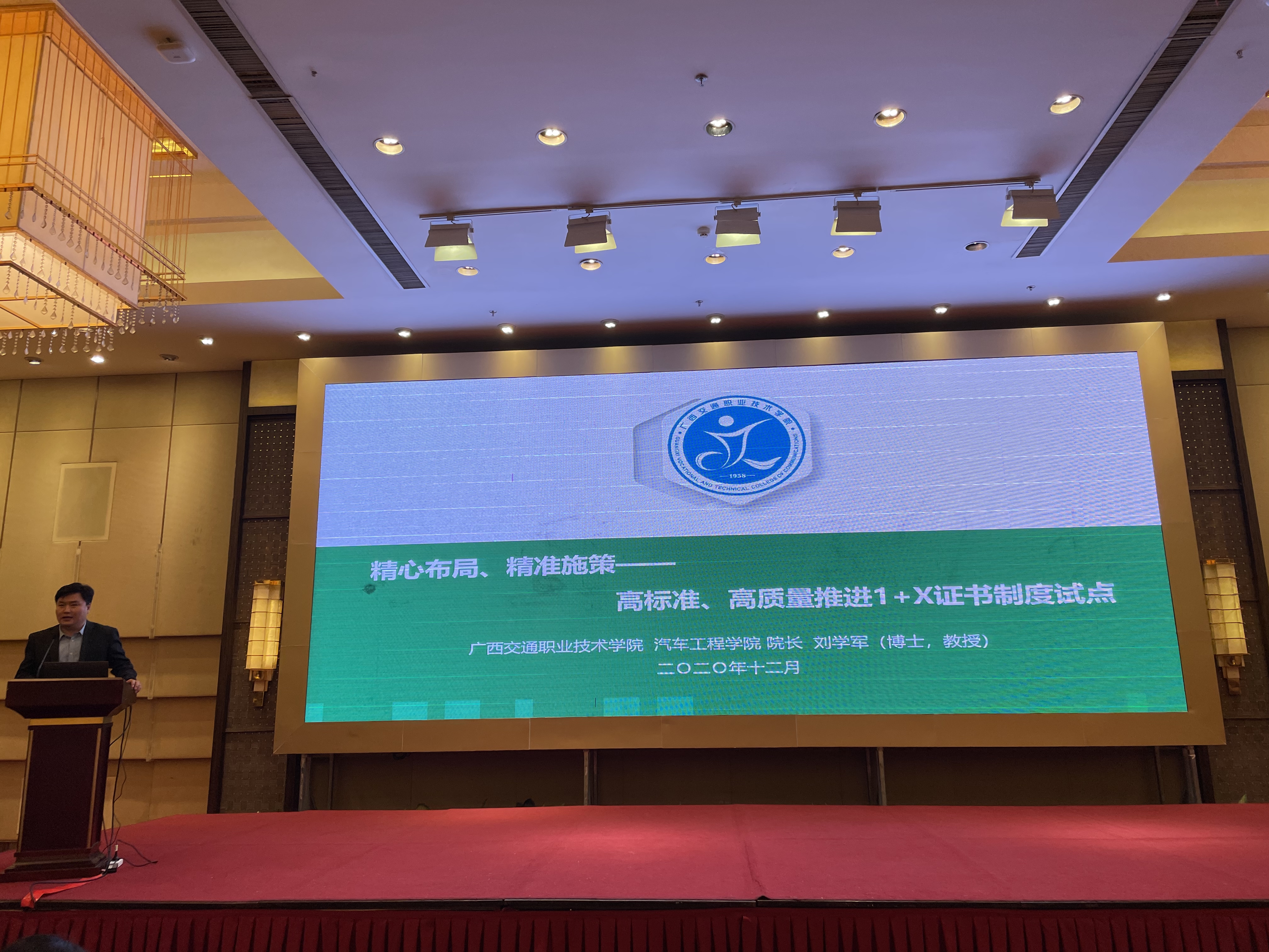(汽车工程学院 讯 吴丹、梁业灿/文 刘学军/图)2020年12月11日-13日,由教育部职业技术教育中心研究所主办,高等教育出版社有限公司承办的1+X证书制度试点与教学改革研讨会在南宁饭店举行。我院院长刘学军参加会议,并作典型经验分享。
