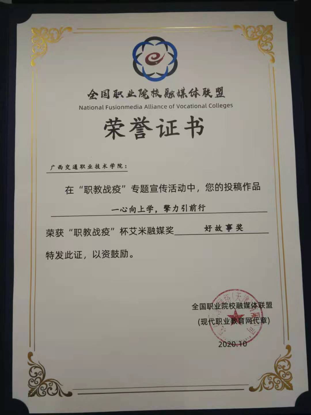 (汽车工程学院 讯 韦丽芳 梁业灿/文 韦丽芳/图)2020年12月7-8日,全国职业院校融媒体联盟2020年会暨融媒教学能力建设论坛在山东青岛举行。联盟举办的“职教战役”专题宣传活动中,共设有特别奖、艺术奖、评述奖、文学奖、科普奖、心灵守护奖6项个人奖和融媒创意奖、好新闻奖、好故事奖、影响力4项单位奖。汽车工程学院投稿的作品“一心向上学·擎力引前行”,荣获“好故事奖”,故事主要讲述我院汽运专业的陆同学在疫情期间克服困难,坚持“停课不停学”线上学习的动人故事。
