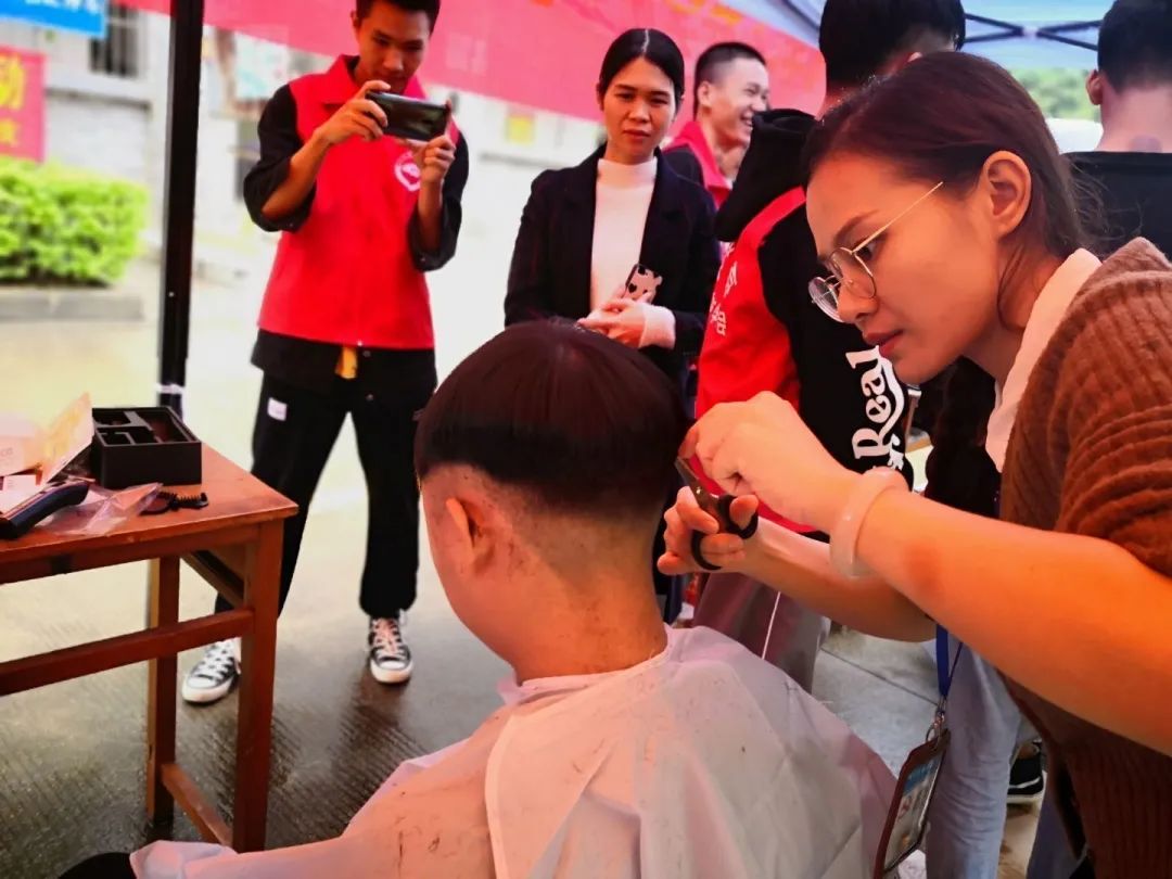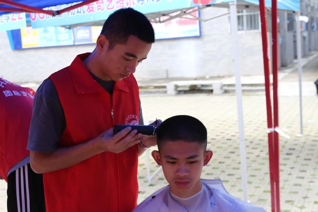 活动开始前,党员教师、退伍军人和入党积极分子各司其职,团结协作,有条不紊的对活动现场进行布置,准备好剪刀、电推、毛巾等理发相关的物品。活动第一天,天公不作美,下起了雨,但还是没有浇灭同学们的参加活动的积极性,纷纷驻足排队。