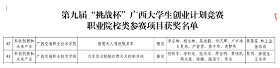 (汽车工程学院 讯 梁业灿/文、图)由共青团广西区委、自治区教育厅、自治区科协、广西学联共同主办的第九届“挑战杯”广西大学生创业计划竞赛,全区共计 60 所学校 1253 件项目通过各校选拔推荐参加自治区复赛。经过大赛评审委员会评审、组织委员会审定,我院报送的项目《智慧无人驾驶服务车》、《汽车发动机舱自燃灭火控制系统》荣获银奖。