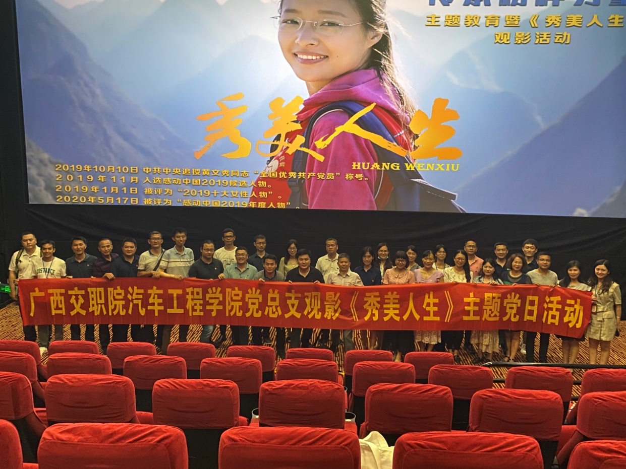 (汽车工程学院 讯 吴丹 韦丽芳 梁业灿/文、图)2020年9月6日起,由自治区党委宣传部策划和组织拍摄,根据第一书记黄文秀先进事迹改编的主旋律电影《秀美人生》在全国公映。为了深入学习黄文秀同志在脱贫攻坚第一线倾情投入、奉献自我,用美好青春诠释了共产党人的初心使命。2020年9月15日,汽车工程学院党总支全体教师党员前往民族影院集中观看。