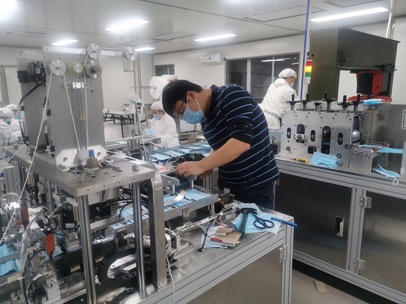3月16日傍晚,接到公司维修调试电话后,连晚饭都没吃,就直奔生产线现场。这是一条新增加的生产线,设备也是赶工赶产生产的,很多地方设计不合理,程序也需要调整,调试工作量特别大,公司总经理特别着急,为了能够尽早调试好设备,林老师与团队这几天连轴转。有一次在找水喝的时候才发现窗外已经天亮,才发现他自己又通宵了,顾不上休息,洗了个脸又继续工作。经过几天的努力,3月21日上午设备终于全部调试完毕,口罩机能够顺利地生产了。