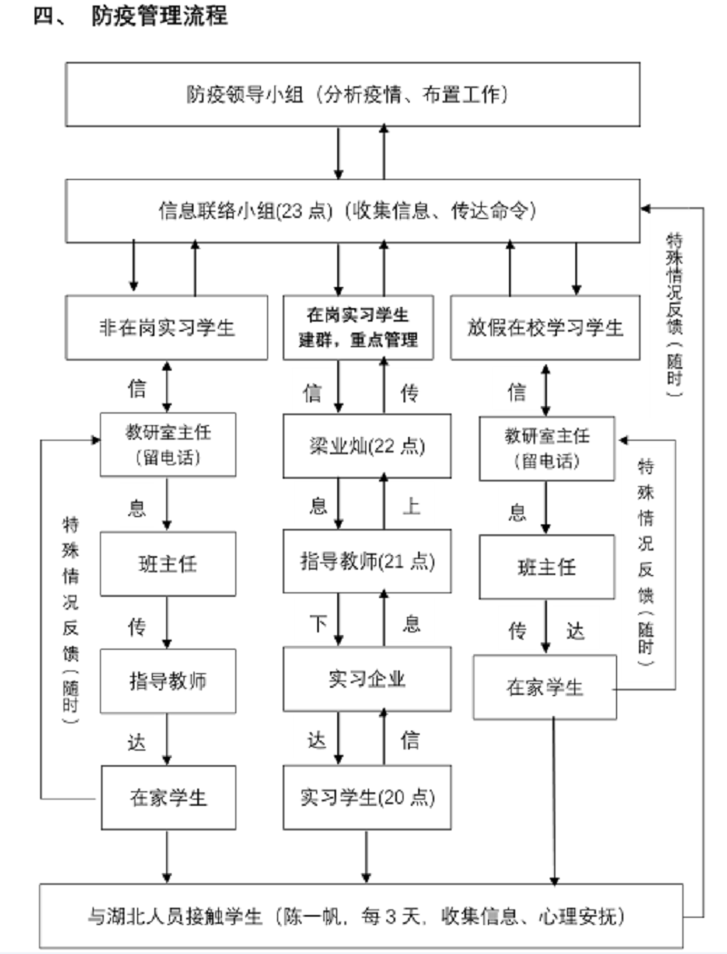 我系积极响应学院疫情防控安排,建立了“学院—系部—班主任(辅导员)—学生”四级疫情防控和信息上报机制,采取 “一对一”包干联系学生工作制度,明确各环节工作要求,采取“人盯人”措施,实行日报告和零报告制度,上下联动,构建“覆盖全体、精准到人”的疫情防控网格管理工作格局。全体班主任、辅导员主动与学生沟通联系,实时掌握了解学生动态,确保做到“一人不漏、一人不错”。