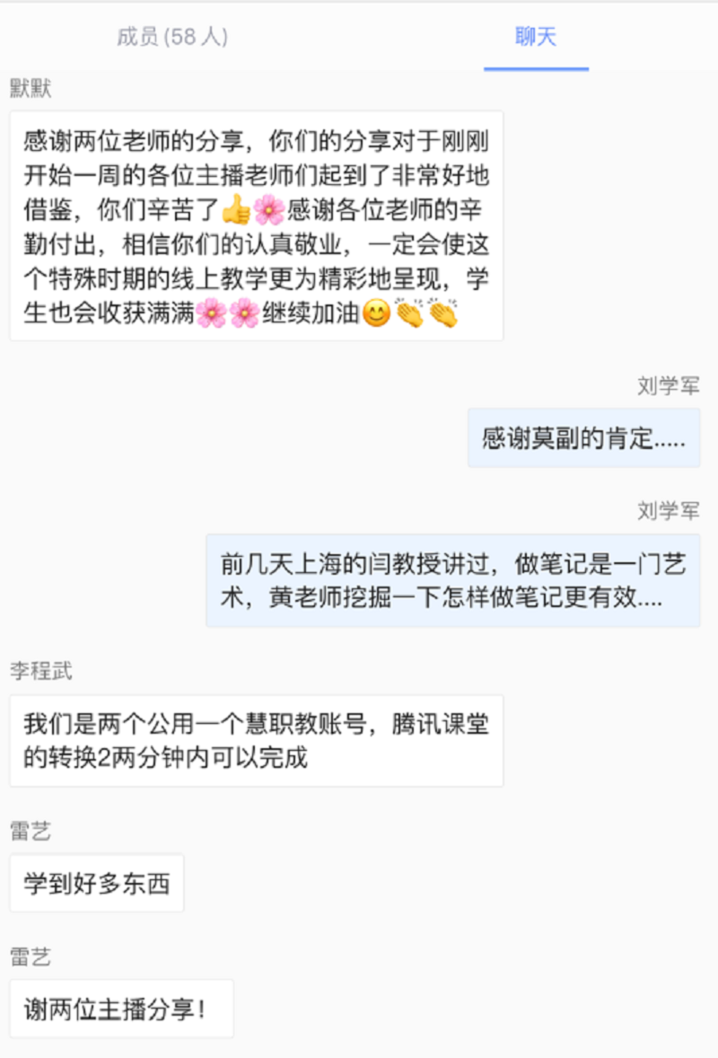 分享环节结束后,大家在线上教学平台的选择与应用、课堂讨论与师生互动环节的设置、作业的布置、课程思政等方面开展了进一步的探讨与交流。参与活动的教师们感到受益匪浅,大家共同取长补短,进一步坚定了做好线上教学的信心。
