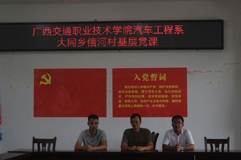 2019年8月21 -24 日由我系李程武、许松两位老师带队在河池市东兰县大同乡信河村开展三下乡暑期社会实践服务活动。与驻村第一书记唐星华老师在信河村建立“爱心传递•梦想飞扬”帮扶基地平台,分别开展“信河村基层党课”、“家电义务维修服务进村屯”、“车辆义务检测、美容与维护服务进村屯”、“车课堂车辆安全使用与清洁保养小技巧”、“慰问老党员”、“屋前屋后卫生大清扫”等实践服务活动。