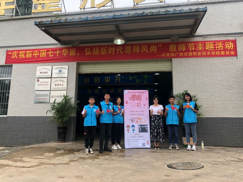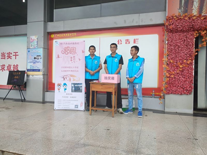 【汽车工程系讯 吴丹、付漓漓、梁海明/文 方荧/图】为了庆祝第35个教师节,汽车工程系6S汽车技术服务社学生社团组织开展了“庆祝新中国七十华诞弘扬新时代尊师风尚”教师节主题活动。本次活动为期2天,社团4位党员教师全程参与并指导活动,活动期间6S汽车技术服务社全体师生利用中午休息时间进行了系列服务师生的活动,赢得了师生的高度赞赏。