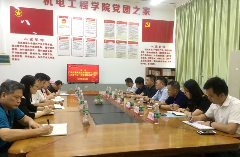 【汽车工程系 讯 付漓漓 梁业灿 /文/图】为了加强党支部建设,学习先进党建管理工作经验,提升党建工作水平,促进校际交流与合作,2019年6月24日下午,汽车工程系党总支一行7人赴南宁职业技术学院机电工程学院学生党支部进行党建交流,该党支部是广西唯一一所在2018年获评“全国党建工作样板支部”的高职院校学生党支部。