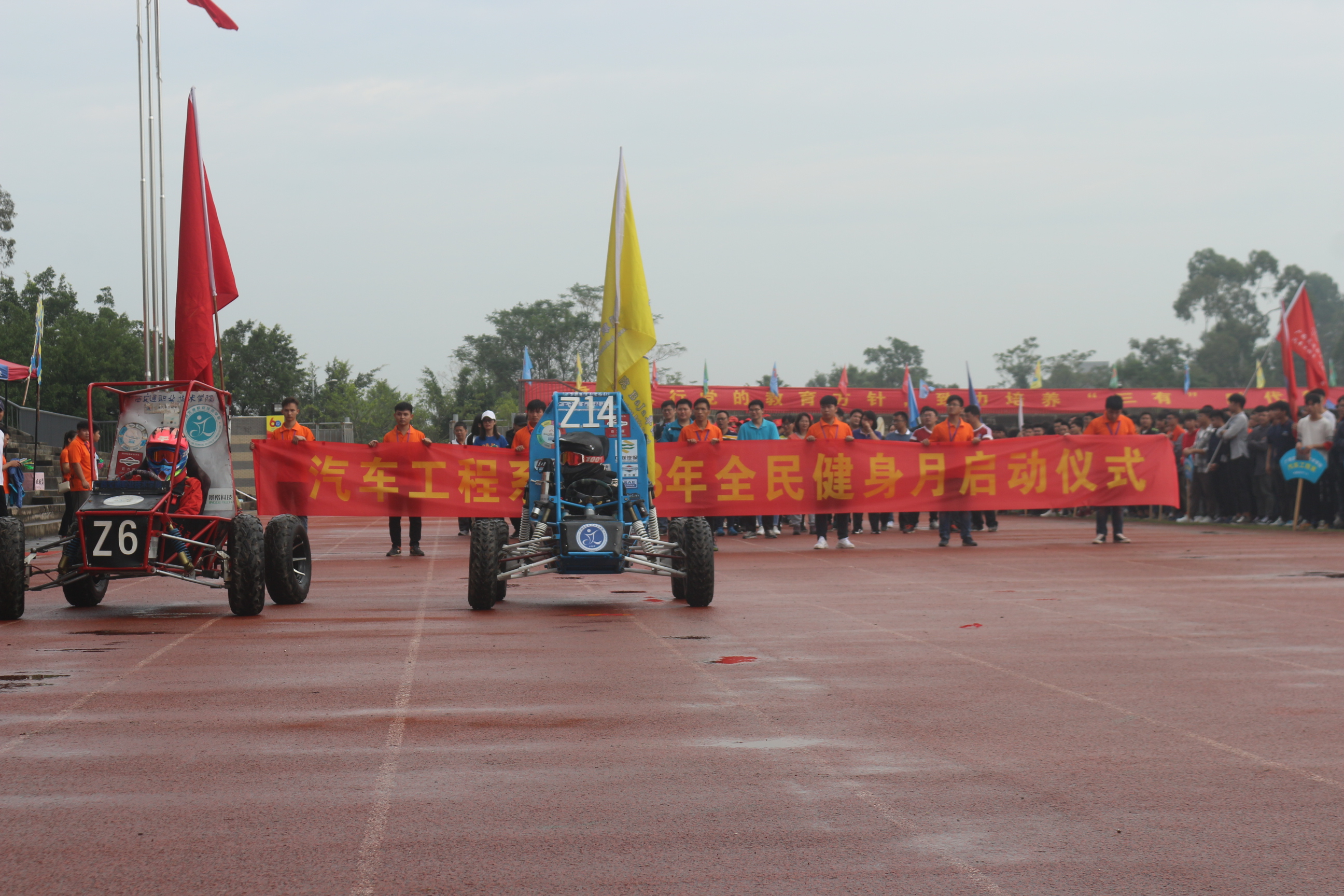 【汽车工程系 讯 吴丹、梁业灿 /文 / 图】 根据2018年全民健身月活动安排,2018年10月27日,为期2天的汽车工程系第九届田径运动在学院运动场拉开帷幕。早上九点整,汽车工程系举行了庄严的升国旗仪式和运动会开幕式。出席活动的有汽车工程系系领导、团总支学生会、Baja车队、6s汽车技术服务社、礼仪队以及全系师生。 此次运动会为期2天,分教师气排球比赛和学生运动会。