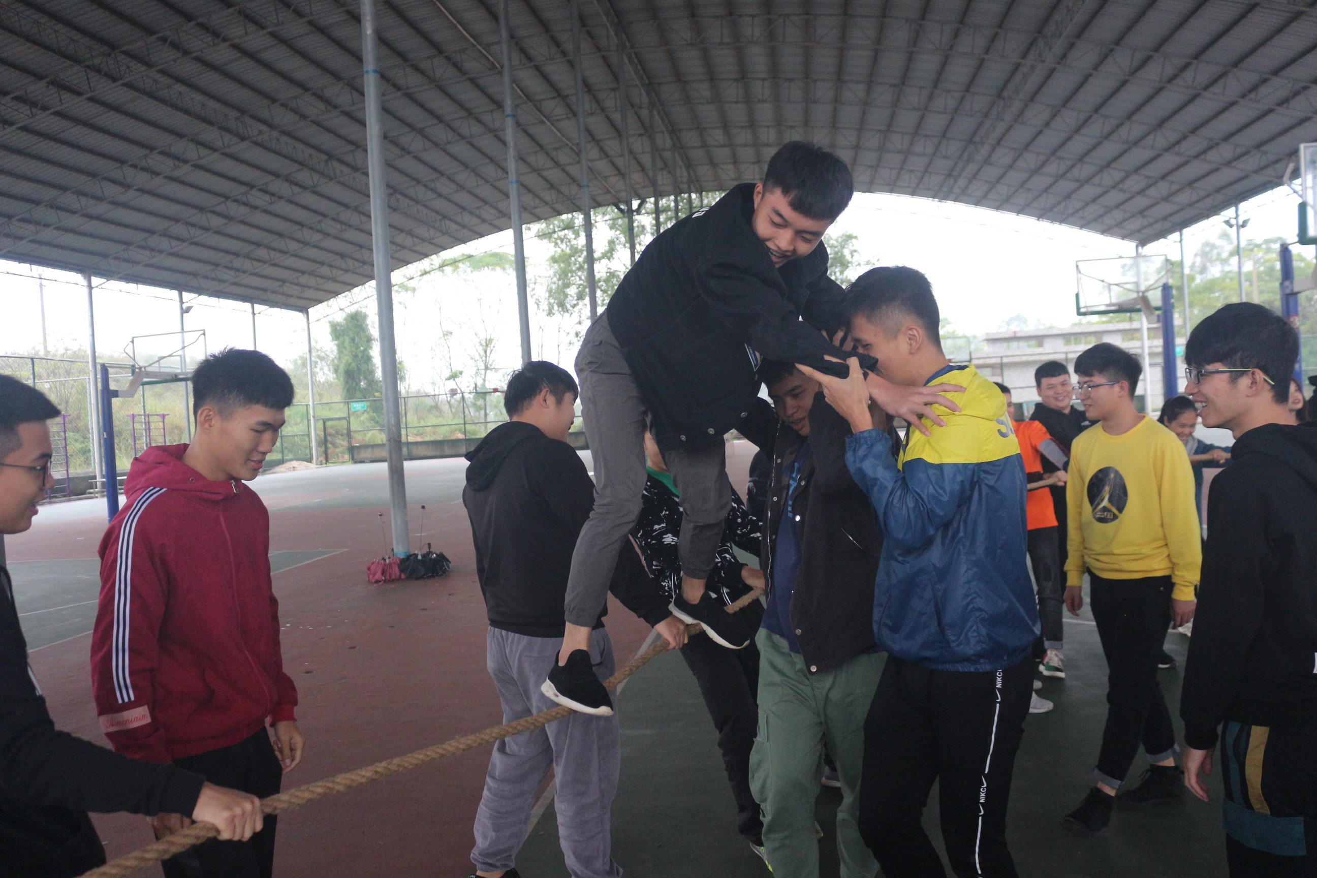 张露尹 梁业灿 黄尧 文/图】为了深入贯彻党的十九大习近平总书记系列重要讲话精神和落实“三全育人”体系内容,作为当代大学生,新时代要有新气象,更要有新作为。践行实践育人,开展团队建设,从而提高我系团总支学生会成员的整体素质,增强团队成员沟通及协作能力。2018年11月18日,我系团总支学生会在风雨球馆开展素质拓展活动。