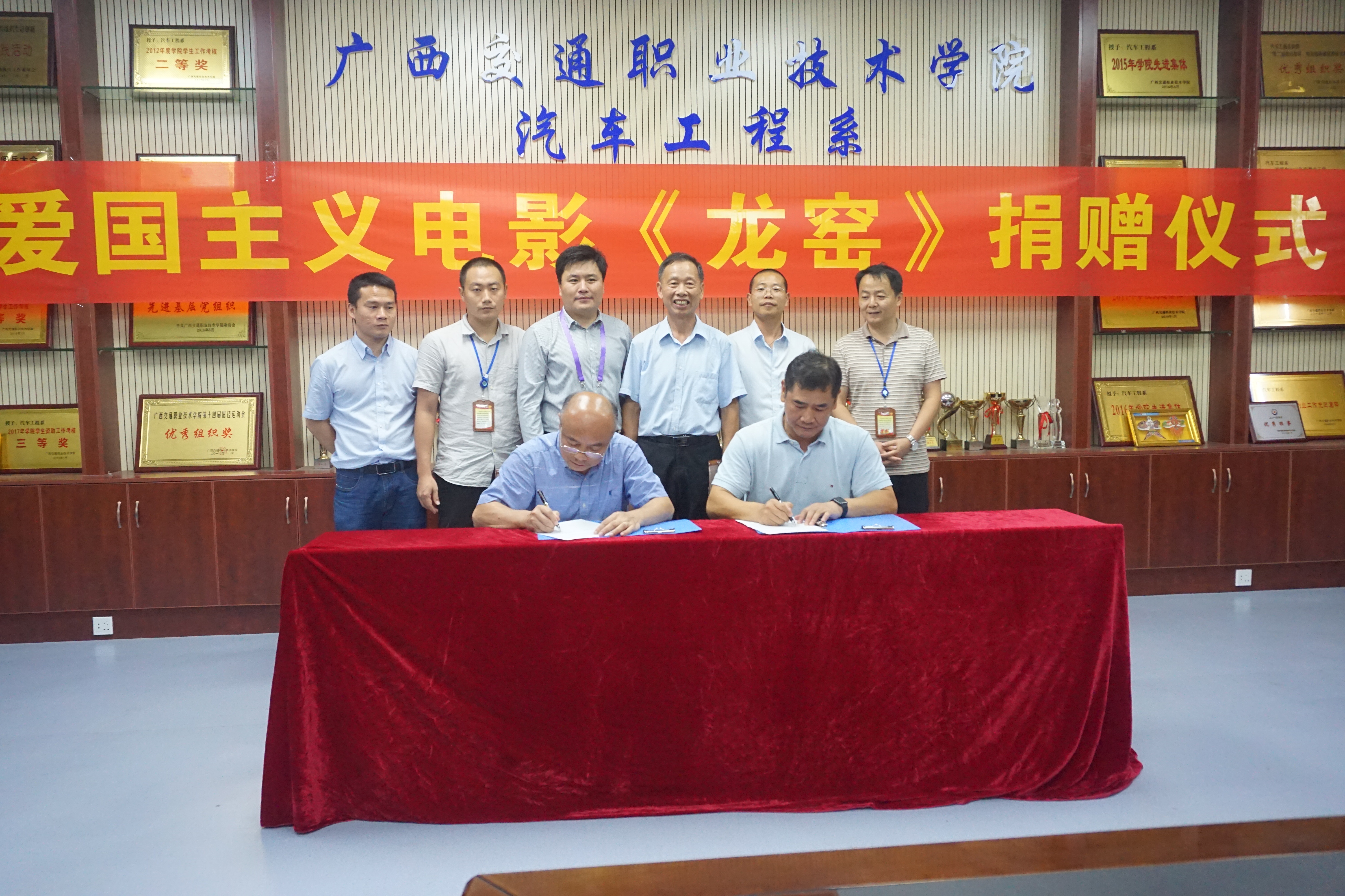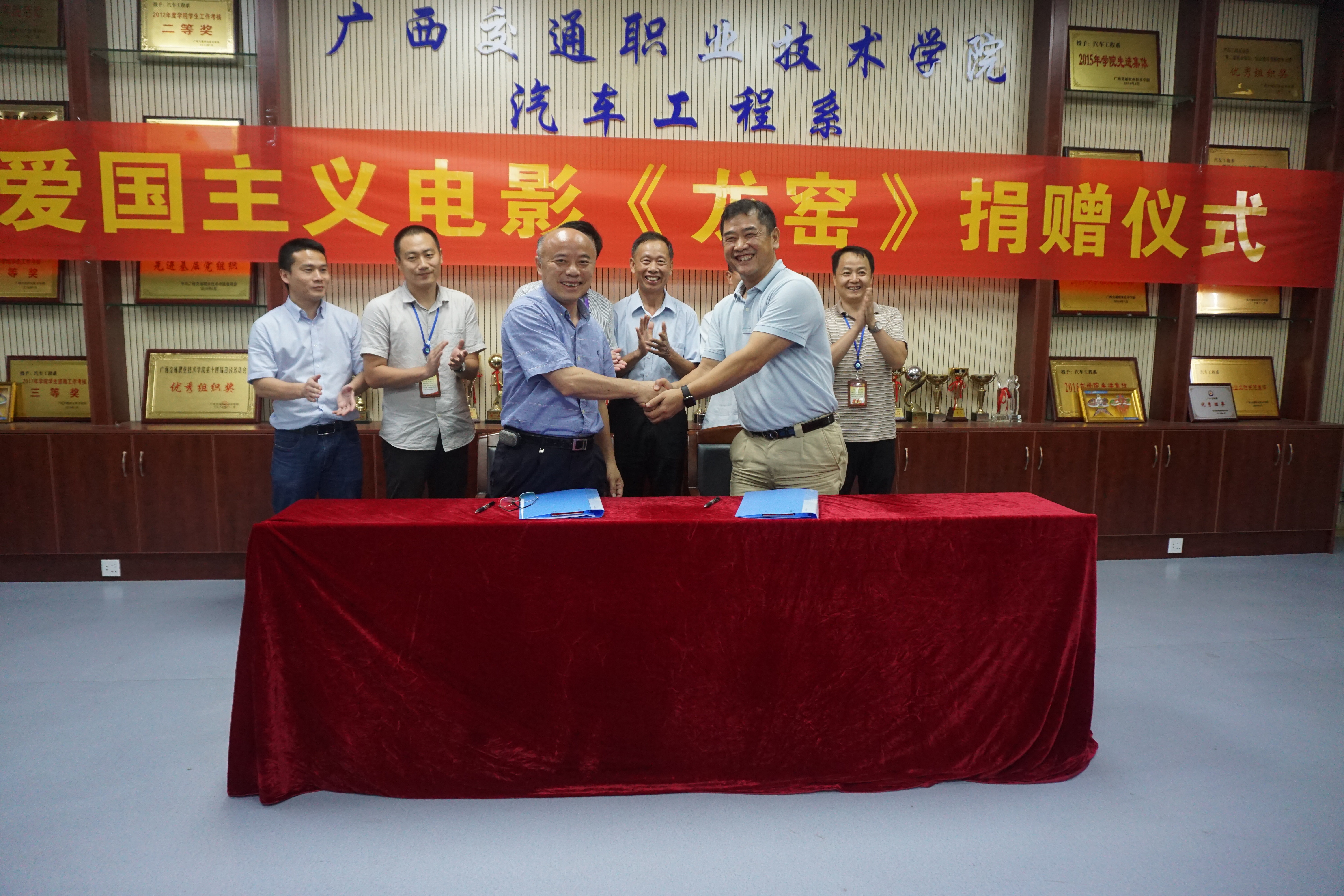 【汽车工程系 讯 吴丹/文/图】作为我院三全育人示范建设试点项目,汽车工程系积极推进校企协同育人项目,经过多次洽谈,2018年9月25日,广西业盛投资集团有限公司向我院捐赠了非遗电影《龙窑》影片。双方在学院昆仑校区汽车楼举行了隆重的捐赠仪式。原自治区人民政府办公厅副巡视员韦能雄,广西业盛投资集团有限公司董事长叶凤琦,人事行政部部长 党军,广西交通职业技术学院副院长 黄琼念,党委工作部部长 林松,学院团委副书记 张佺,汽车工程系主任