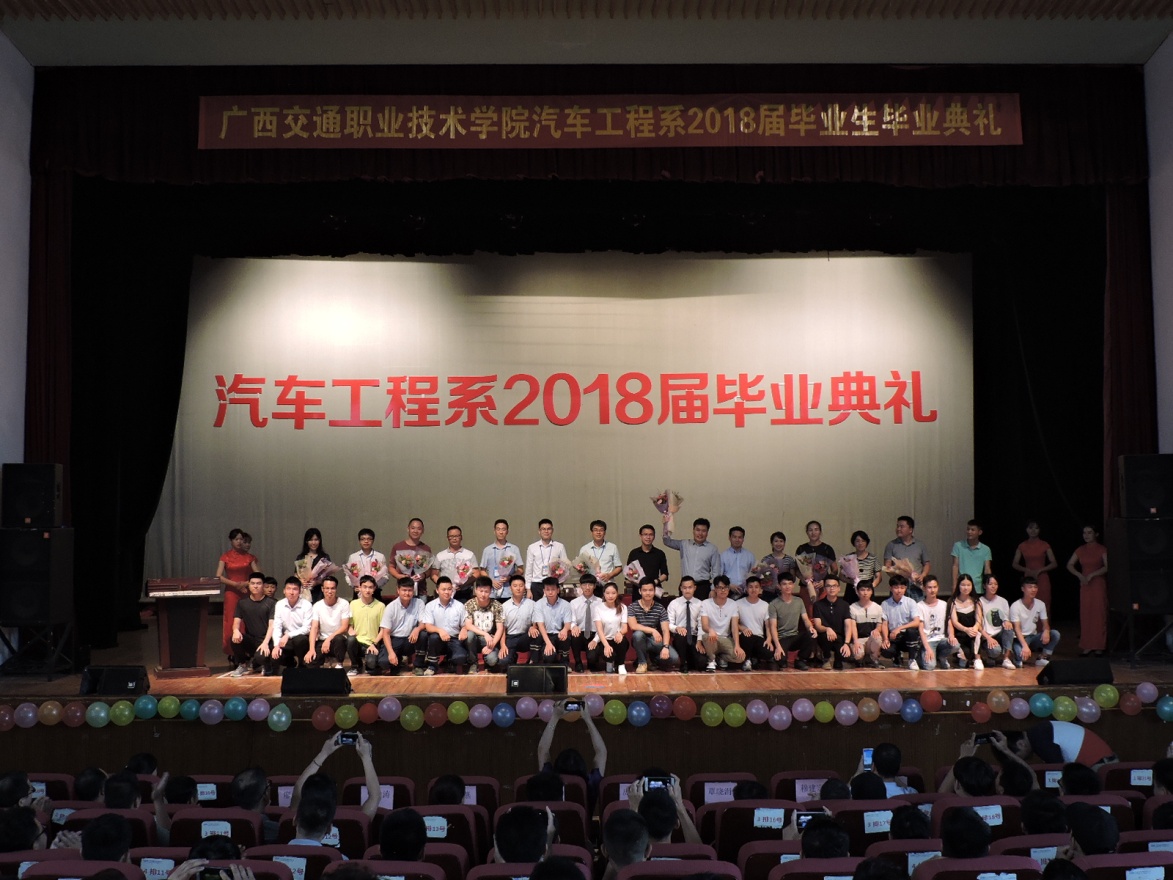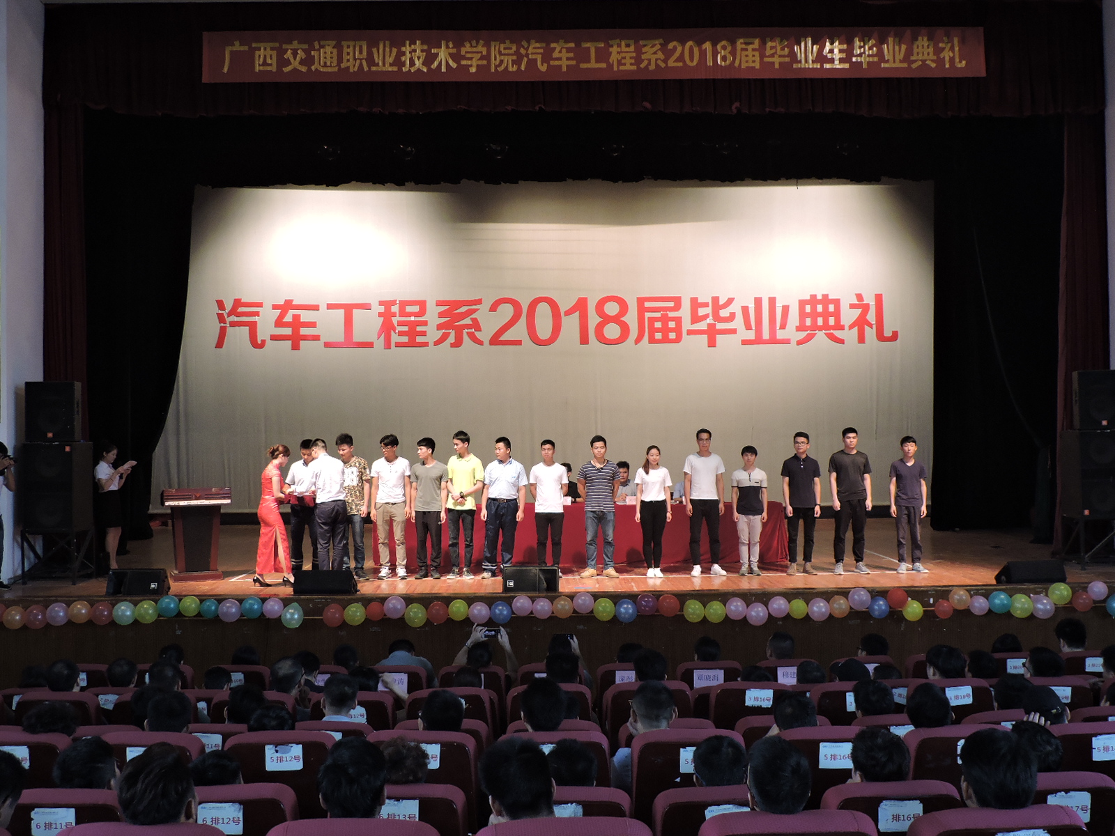 汽车工程系刘学军主任在毕业典礼上发表致辞,宣读学院关于毕业生获得毕业资格的决定,并对2018届毕业生顺利毕业,即将走上社会表示热烈祝贺,希望同学们不忘母校,踏实工作,不断取得新成绩。汽车工程系党总支副书记梁科,宣读广西普通高等教育优秀大学毕业生表彰决定,授予荣誉证书及纪念品。汽车工程系谢军副主任,宣读学院三好学生、优秀班干、先进班级表彰决定,授予荣誉证书。通力电梯南宁分公司维保部经理黄义冲宣读通力冠名班奖学金表彰决定,授予荣誉证书。毕业生代表蒋凤凤上台发言,感谢悉心培养她的学校,表达了对母校依依惜别之情。毕业典礼以毕业生代表向全体教师献上鲜花,行谢师礼画上圆满的句号。
