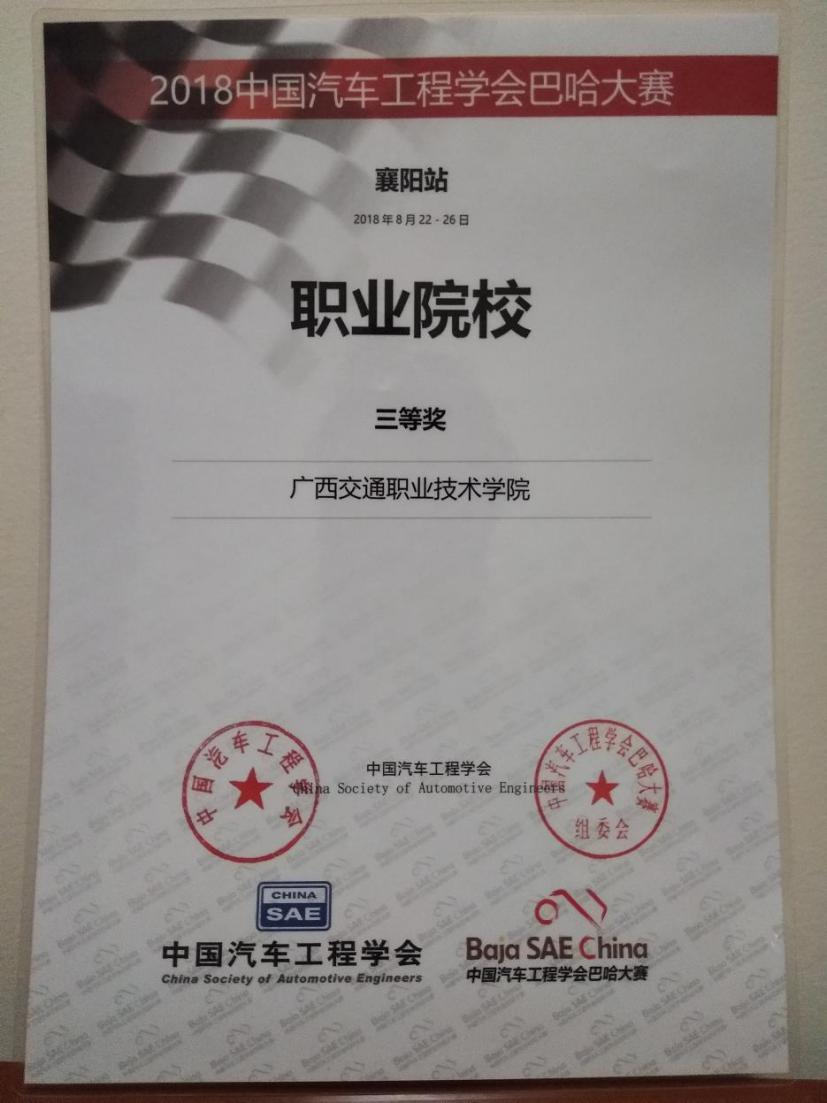 2018年中国汽车工程学会巴哈大赛襄阳站历时5天,最终总成绩获得三等奖,“无巴哈,不青春”,在下一年里我们不会松懈,不会放弃,将设计制造出一辆更加完美的赛车,取得更好的成绩。