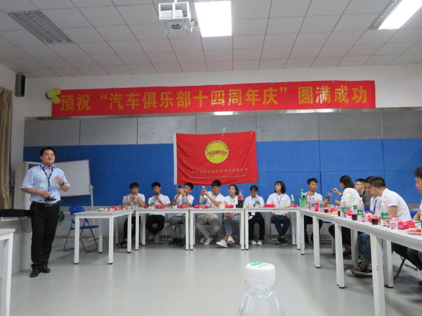 汽车俱乐部指导老师覃炳露高度赞扬了俱乐部的各项服务活动,并分享了见证俱乐部成长过程后的心得体会,祝福我们的汽车俱乐部越办越好。劳协学长向学弟学妹分享了自己从加入社团一直到毕业工作的成长经历,鼓励大家要利用好汽车俱乐部这个大平台好好学习、好好锻炼自己,劳协学长感慨说,在汽车俱乐部工作的日子里,是他大学最美好的时光。2015级社团主席赵星任学长分享了自己在岗位上实习的心路历程。回想起在校时带领社团组织策划各项活动,再和现在的工作比较,赵星任学长感慨道,吃得苦中苦,方为人上人。活动在集体合唱生日祝福的歌声中推向了高潮。