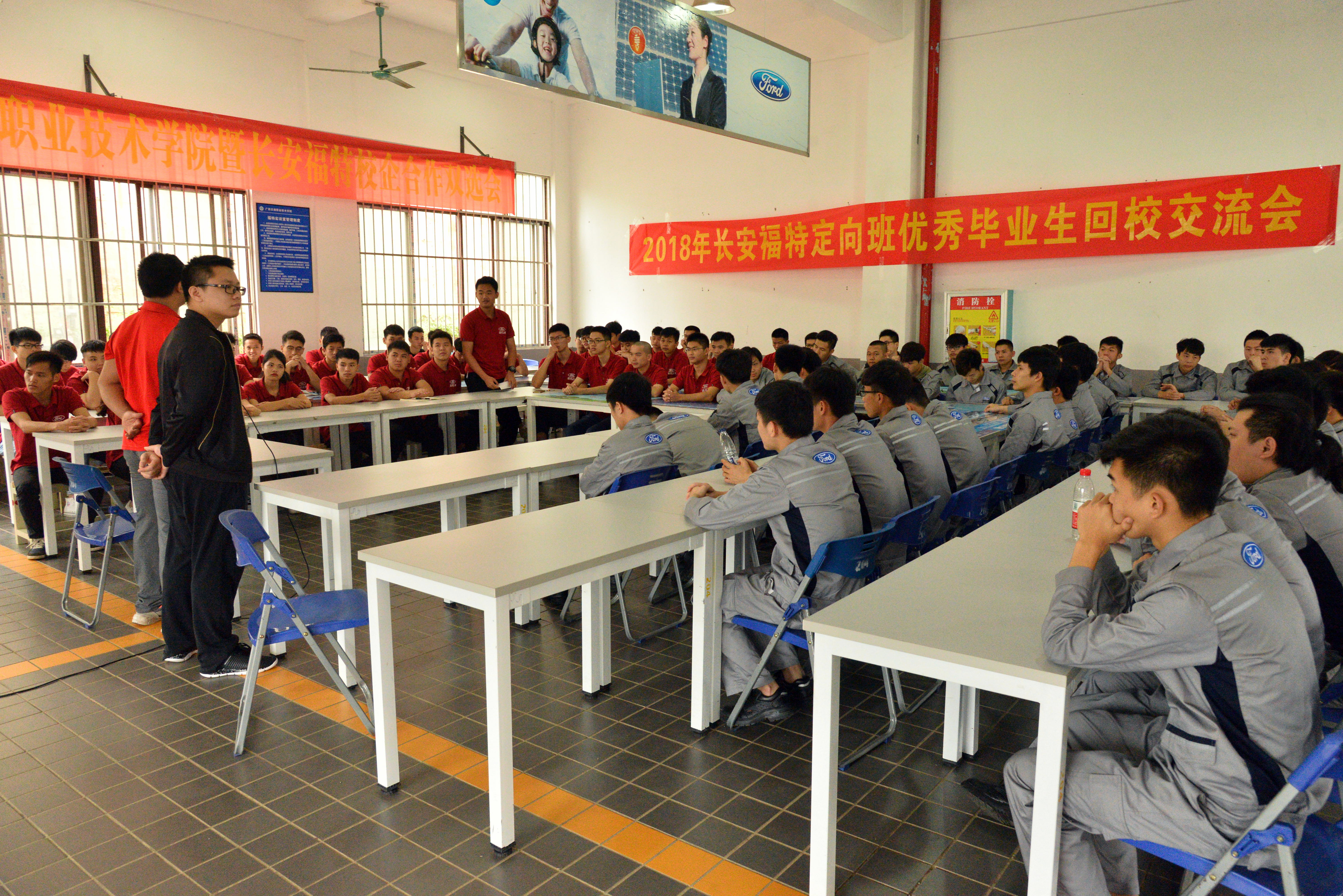【汽车工程系 讯 吴丹 罗杰斌/文/图】2018年4月27日上午10:30分,在我院四塘校区汽车楼长安福特实训室成功举行了“2018年长安福特校企合作专场双选会”和“2018年长安福特校企合作定向班优秀毕业生返校交流会”。