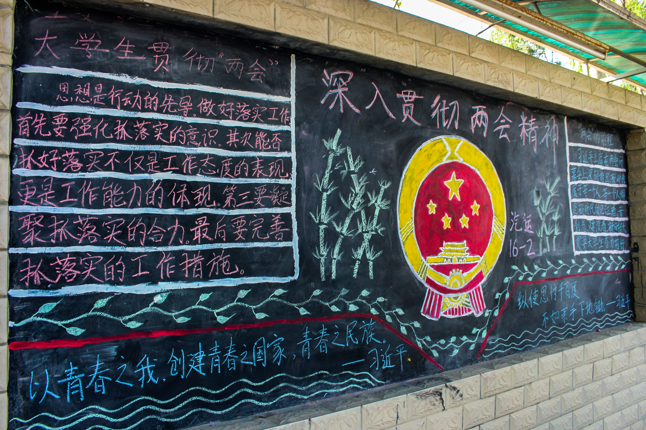 为了营造学习2018年“两会”精神氛围,广泛宣传全国“两会”内容,3月中旬,我系学生党支部开展了“聚焦两会”主题黑板报活动。同学们通过认真阅读两会报告,了解“两会”动态,用彩笔绘画出了学习感想。