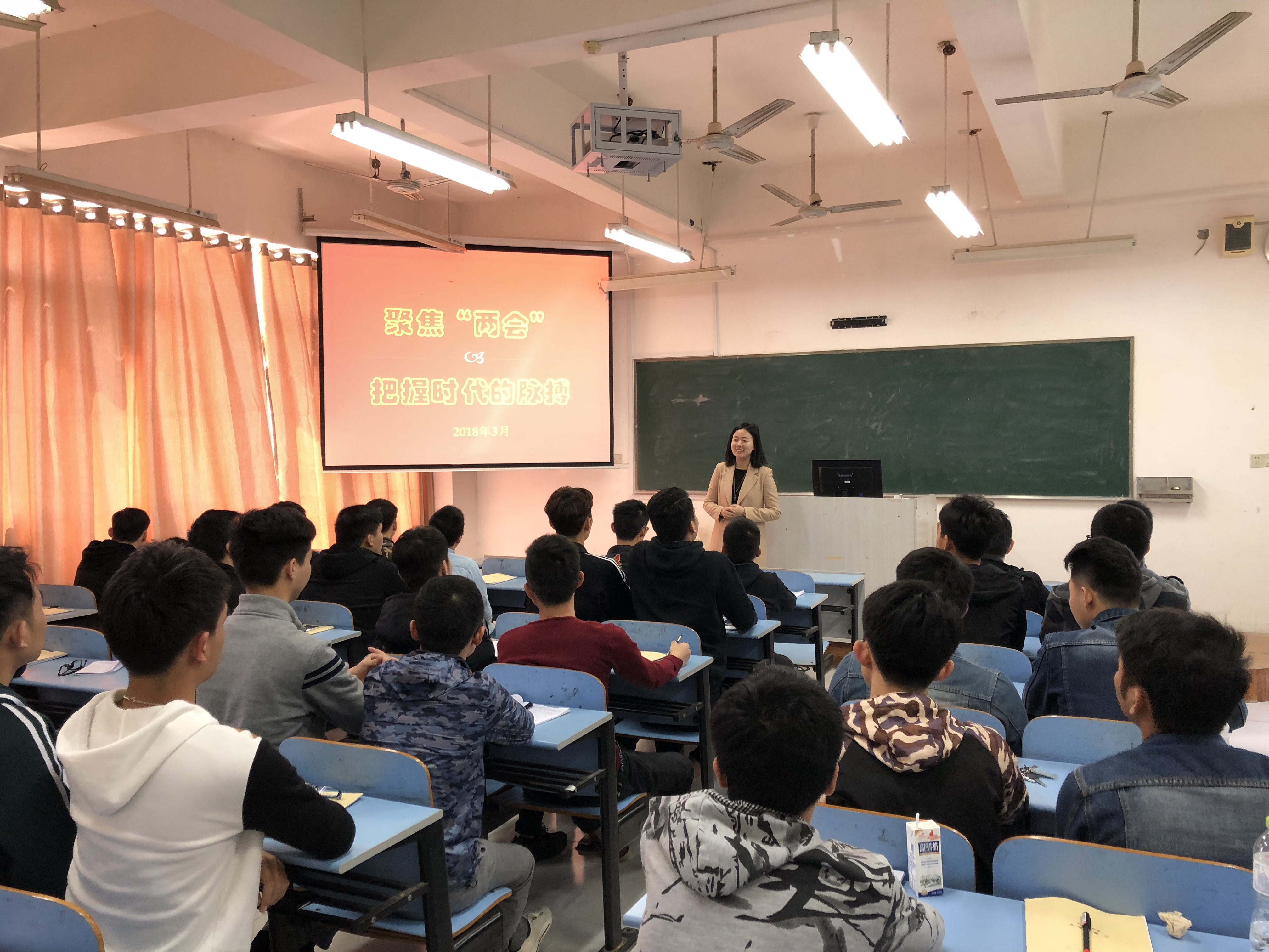 3月24日学生第二党支部书记付漓漓走入班级,开展了“聚焦两会,把握时代脉搏”主题班会。重点对习近平总书记在2018年全国两会上的系列重要讲话精神、2018年政府工作报告部分内容进行了梳理讲解。在会上,大家对汽车新能源技术的发展前景、交通行业的发展规划、全面实施“中国制造2025”等内容表现出了热切的关注。