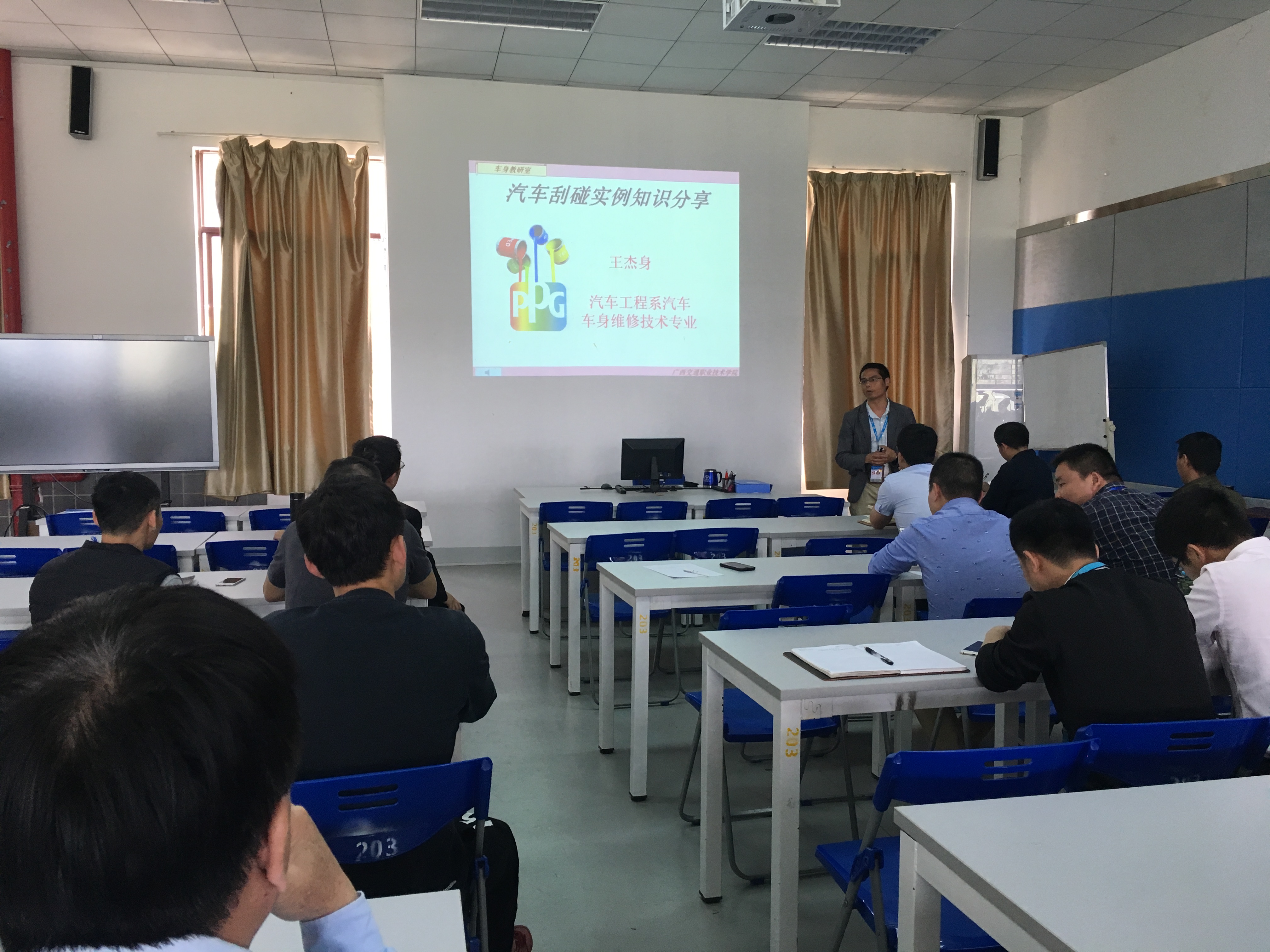 本次专业教研活动由汽车工程系车身教研室王杰身老师主讲,以“汽车刮碰实例知识分享”为主题,用大家平时常遇到的汽车刮碰的实例分析,结合一些先进车身材料,先进维修工艺,汽车车身维修现状及发展趋势。课程在比较严肃而又轻松的氛围中开展,我系教师深入交流探讨汽车漆面的相关知识。