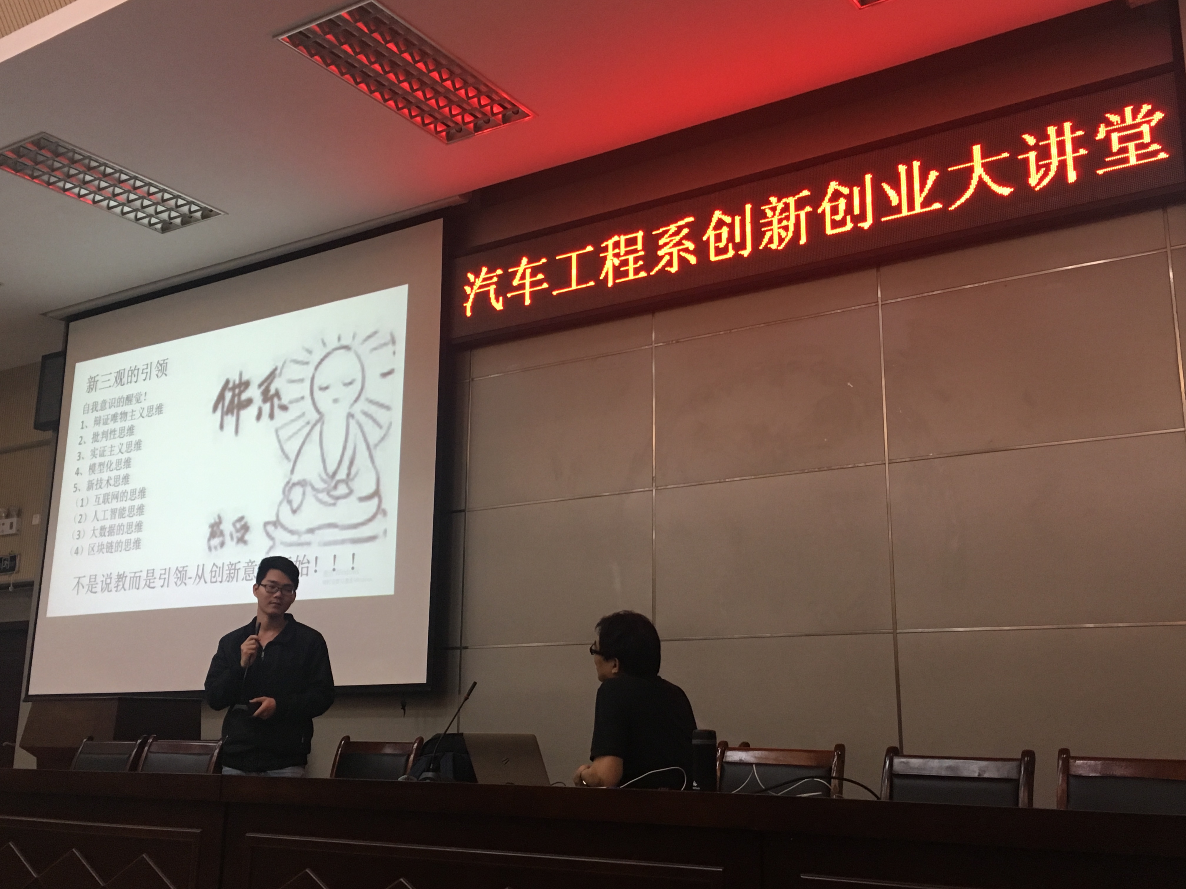 讲座开始之初范老师用“佛系青年”的例子进行引入,用活泼生动的语言将学生的注意力带入讲堂中,并从新时代新机遇新三观、多维自洽动态思维模型、中关村软件园的创新课、创新创业理论创意实践、大学生创新创业意识的培养共五方面分别展开讲述。
