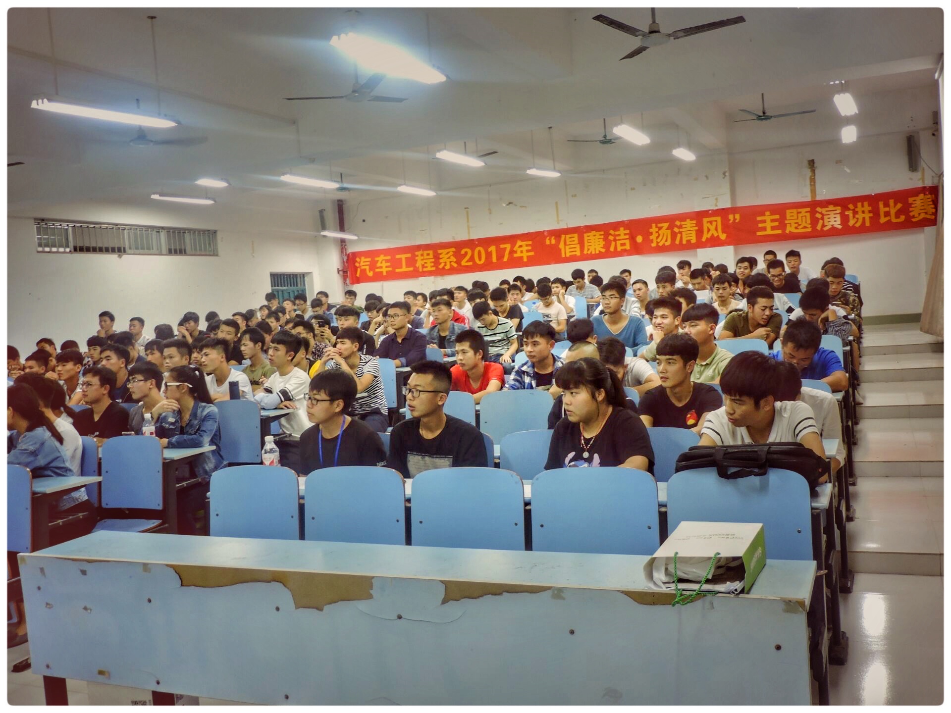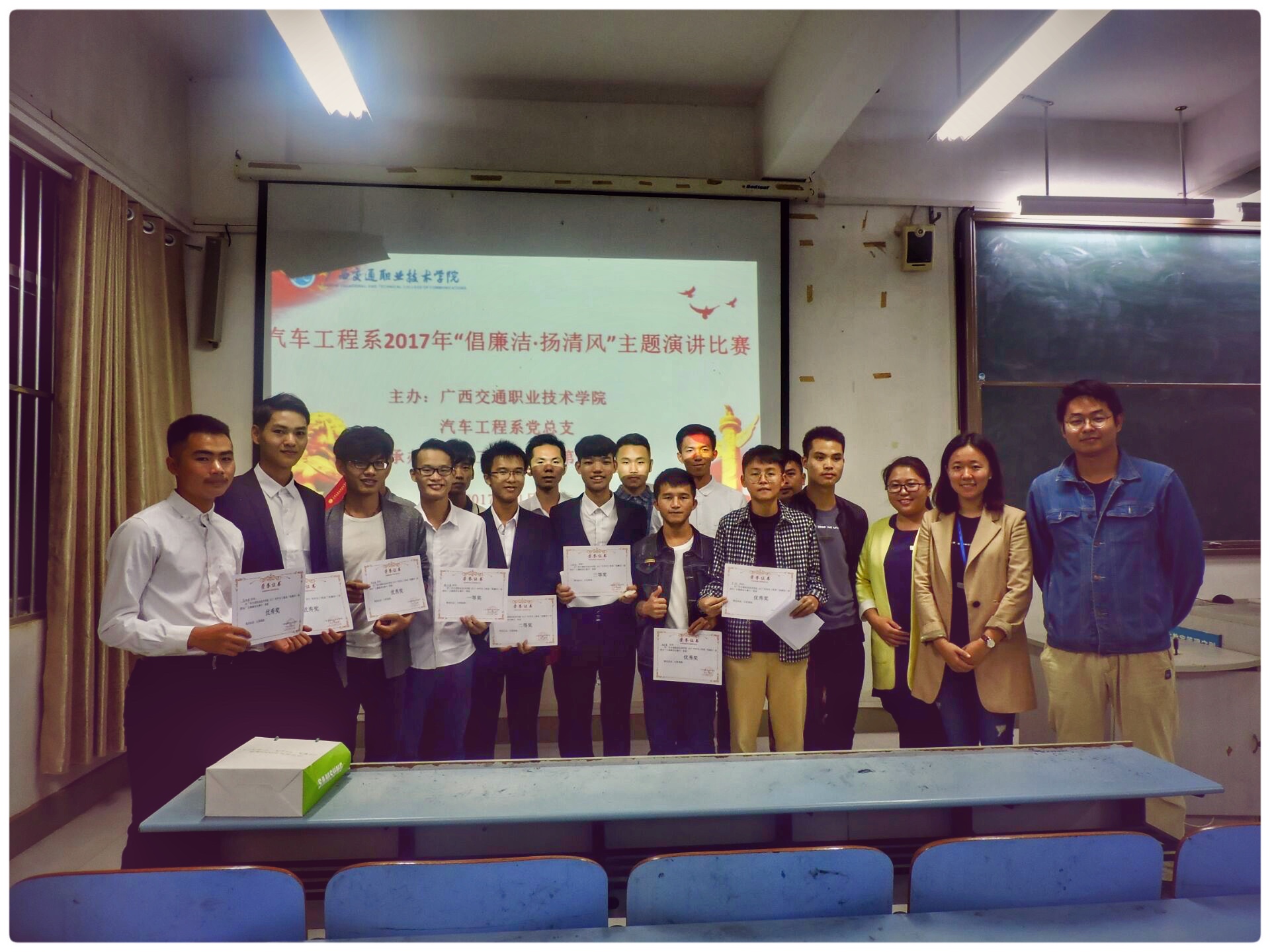 【汽车工程系 吴丹 梁海明 文/付漓漓 图】11月17日周五晚,为全面深入贯彻学习党的十九大会议精神,由汽车工程系党总支主办、汽车工程系学生第二党支部承办的汽车工程系2017年“倡廉洁·扬清风”主题演讲比赛在四塘校区综合楼B203举行。我系学生党支部教师党员、入党积极分子参与了本次活动。