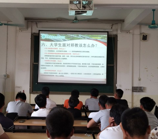 同时为加强反邪教警示教育,营造学院崇尚科学、反对邪教、传播文明、反对迷信的良好校园氛围,不断提高师生识邪、辨邪、防邪、反邪的能力,筑牢基层反邪防线,维护学院的安全稳定,各班召开“崇尚科学、反对邪教”的主题教育班会。对15级在校外顶岗实习学生也进行了网上相关教育,效果良好。
