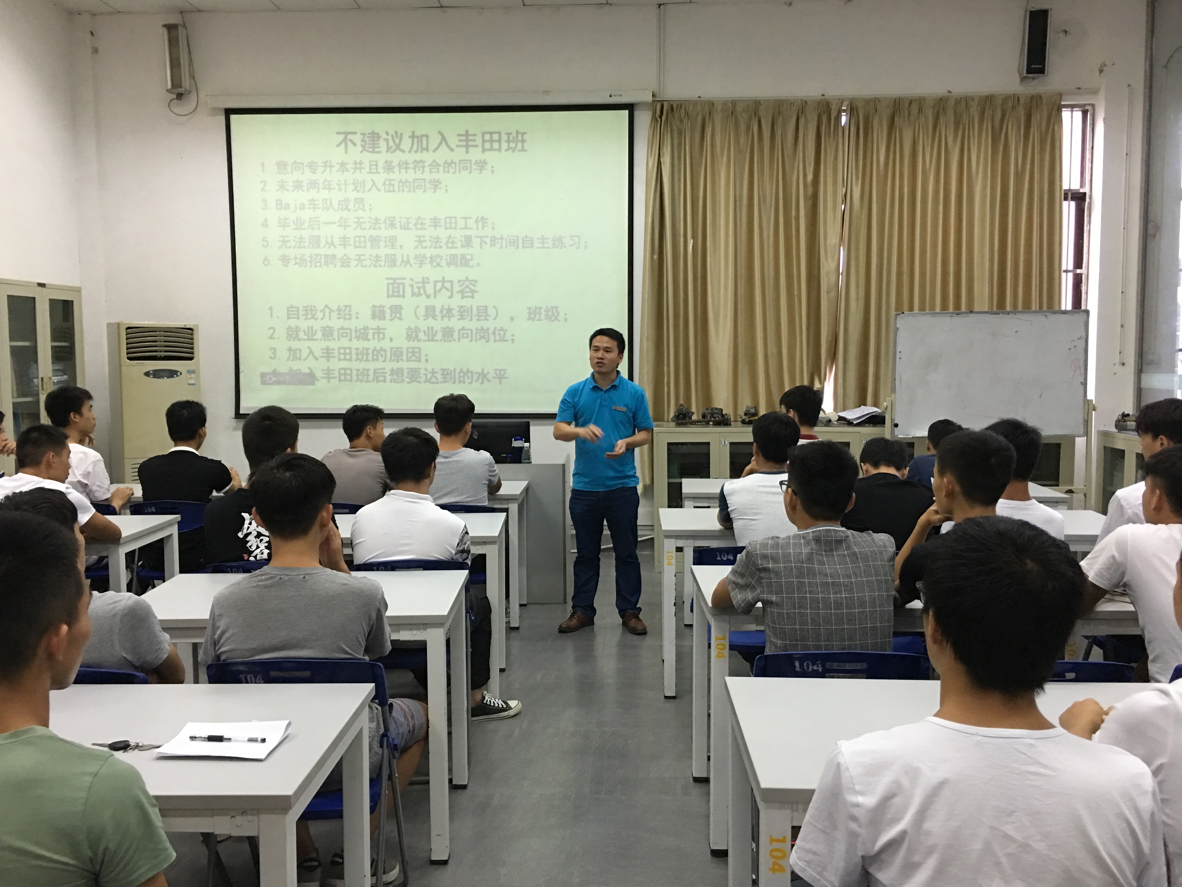 【汽车工程系 讯 吴丹、 林松/文 林松/图】 10月12日晚,2019届丰田定单班组班的面试会在我院四塘校区汽车楼一楼丰田教室举行。