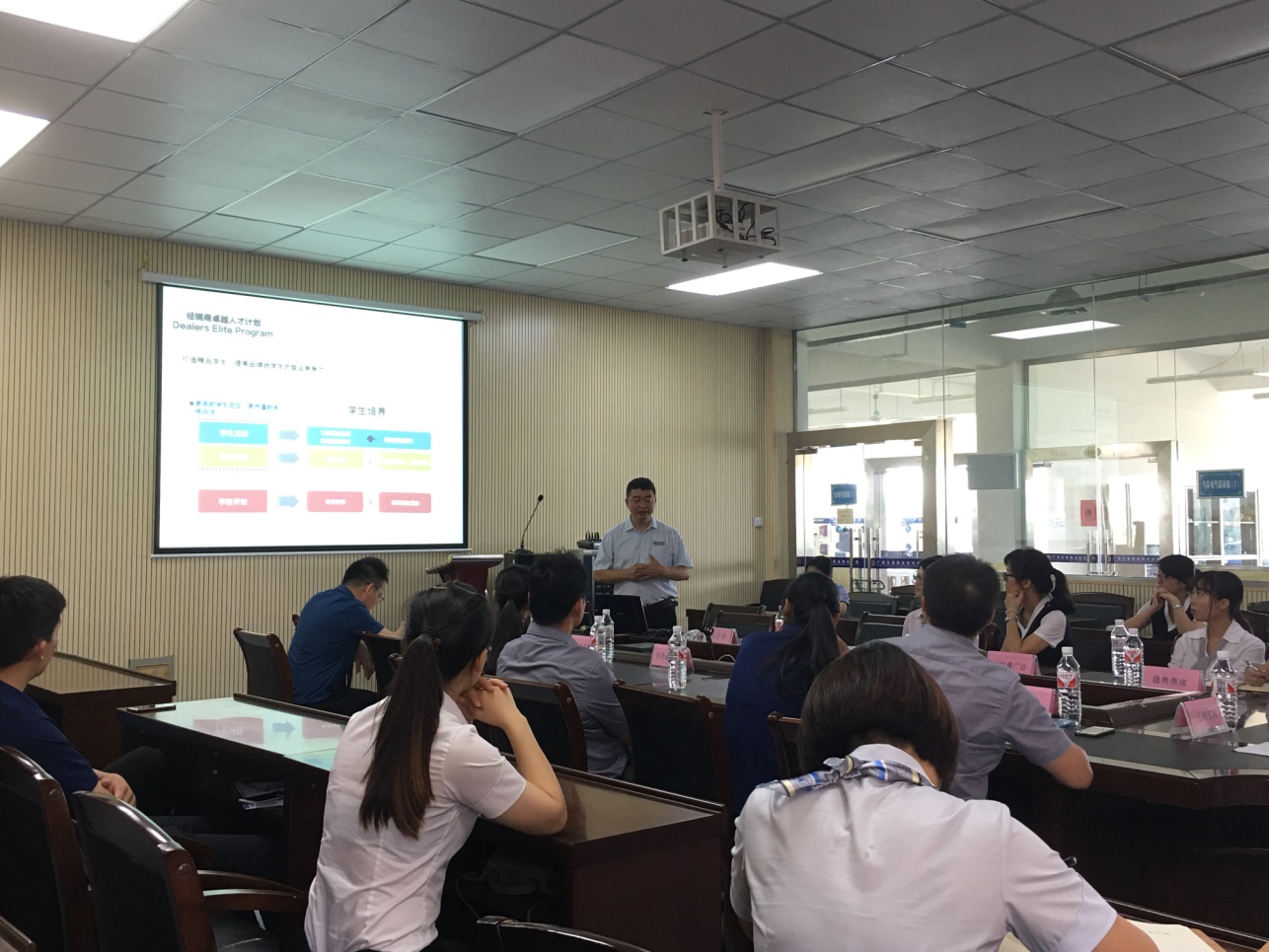 在学校与经销商座谈期间,我系刘存香主任发表致辞,欢迎各经销商企业的到来,并由彭高颖老师介绍了我系大众品牌班的教学、学生人数等情况,并针对以往学生实习期间出现的状况提出意见和建议,得到了经销商企业的认可。