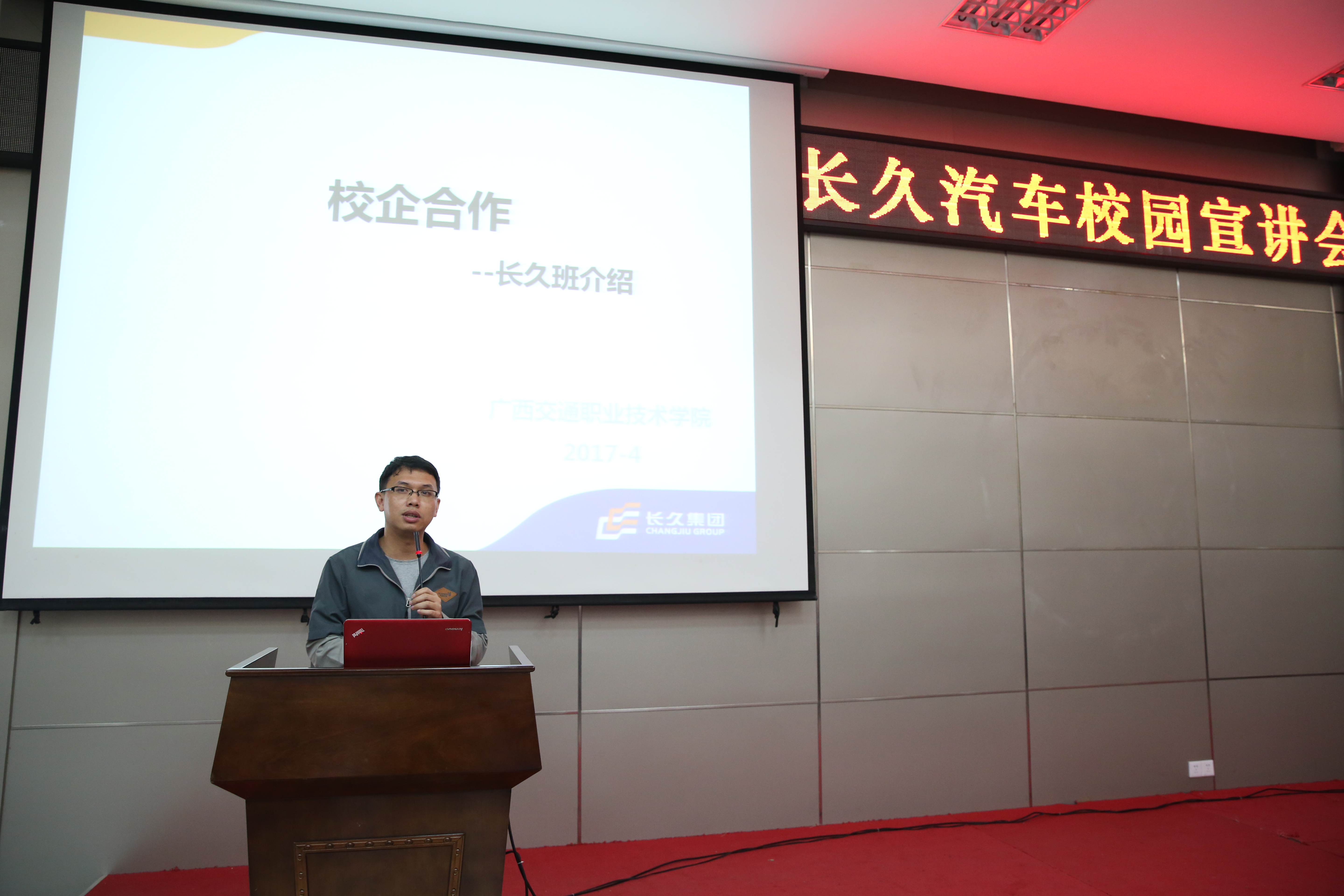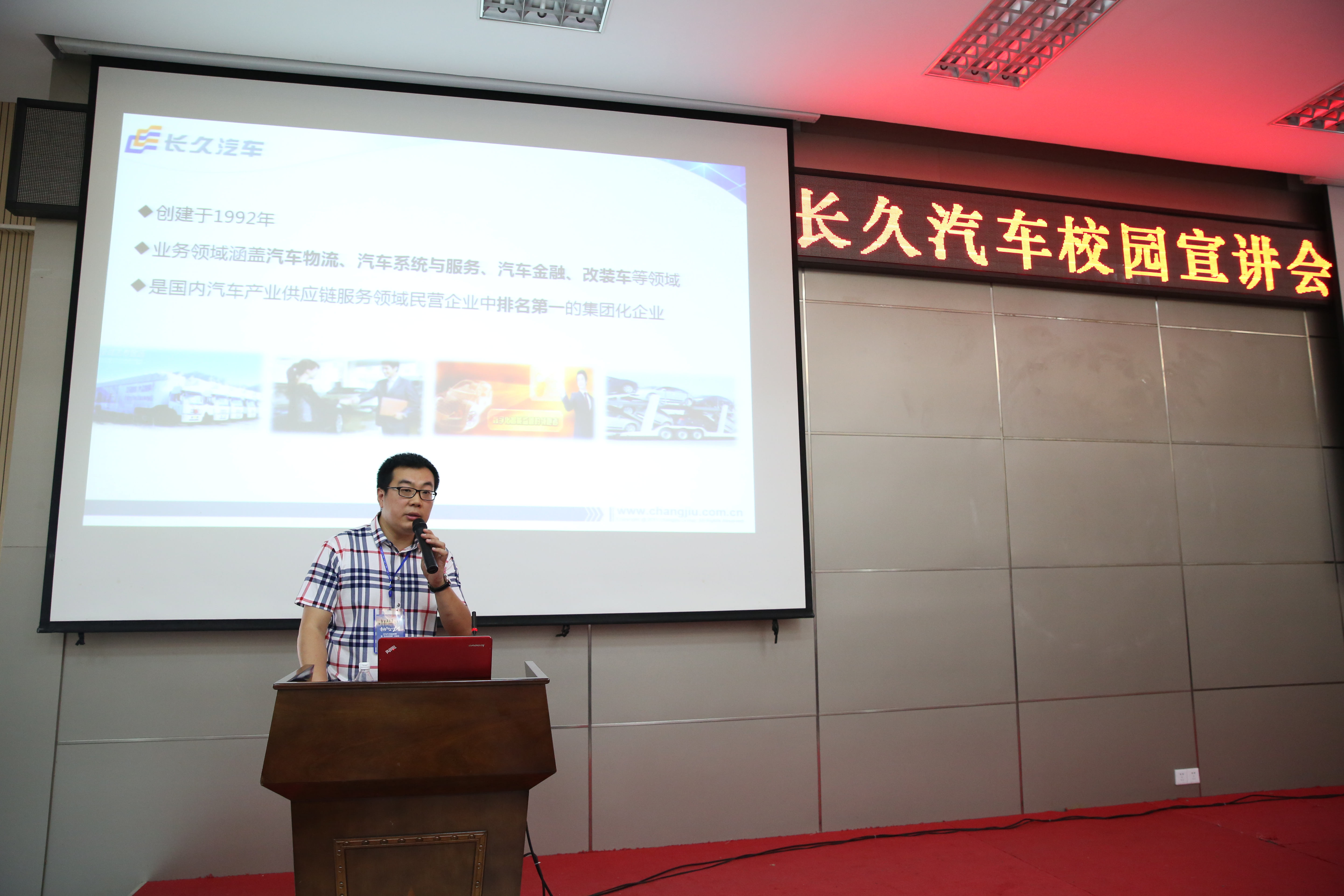 (汽车工程系 讯 吴丹 覃晓涓/文 梁志宇/图) 2017年4月25日下午,汽车工程系在学院四塘校区C2多功能厅成功举行2017年“长久汽车”校园宣讲招聘会,长久汽车行政人力招聘经理刘欣哲先生、长久汽车各经销店共11名部门经理、汽车工程系刘存香主任出席本次宣讲会,我系200多名2015级学生参加宣讲招聘会。