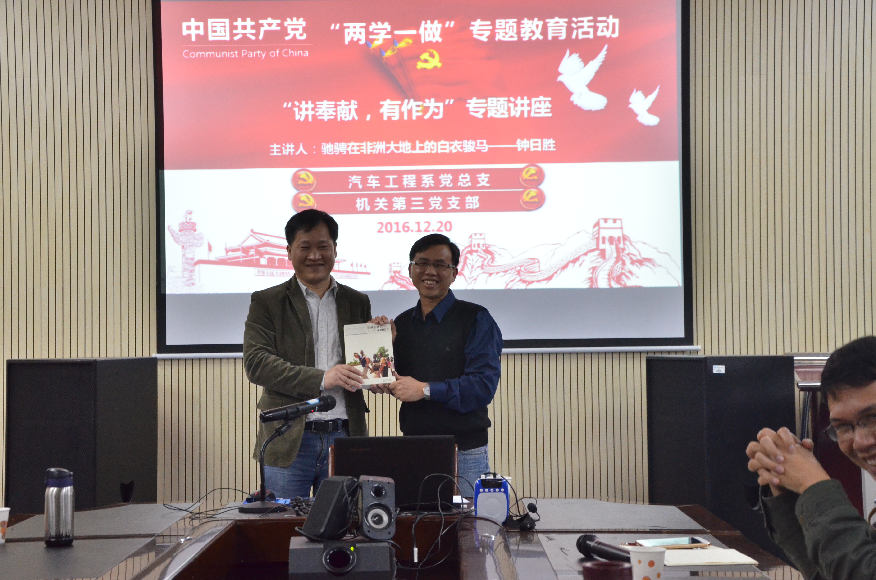 汽车工程系党总支负责人做了总结,并向钟日胜医生表示感谢,号召各位老师以钟日胜医生两次医疗援助非洲的无私奉献精神作为榜样,以实际行动去诠释并实践“讲奉献、有作为”的主题,为学院的发展做积极的贡献。