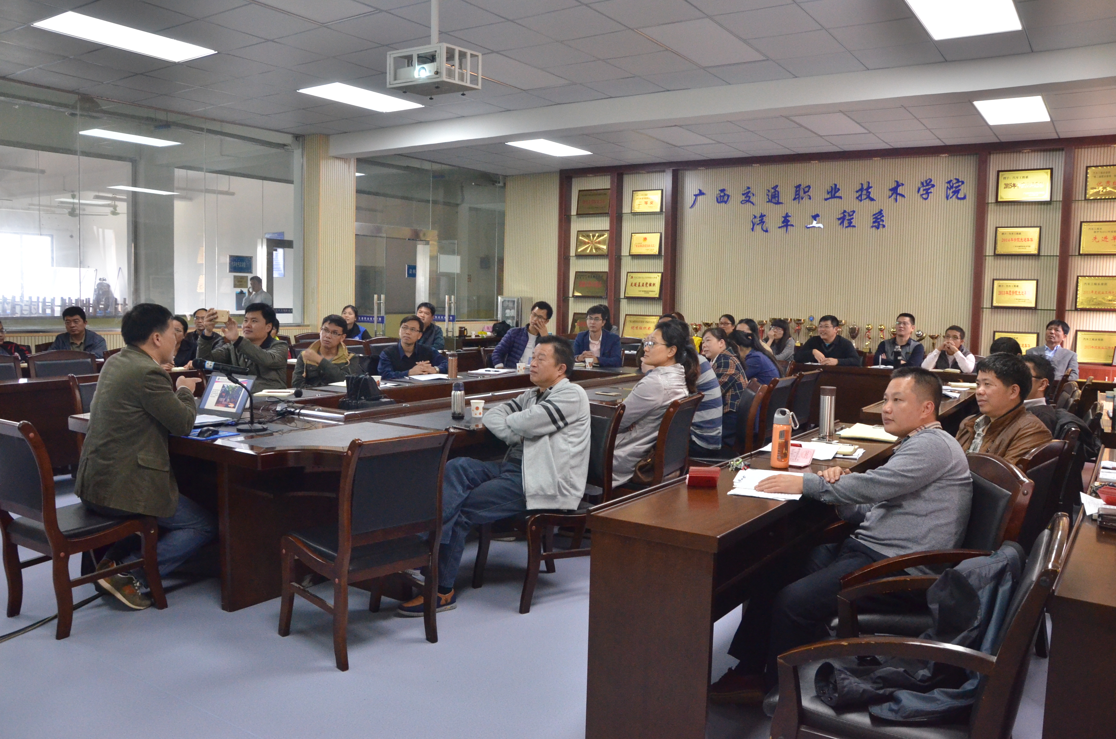 汽车工程系全体教师及学院机关第三党支部全体党员在聆听讲座