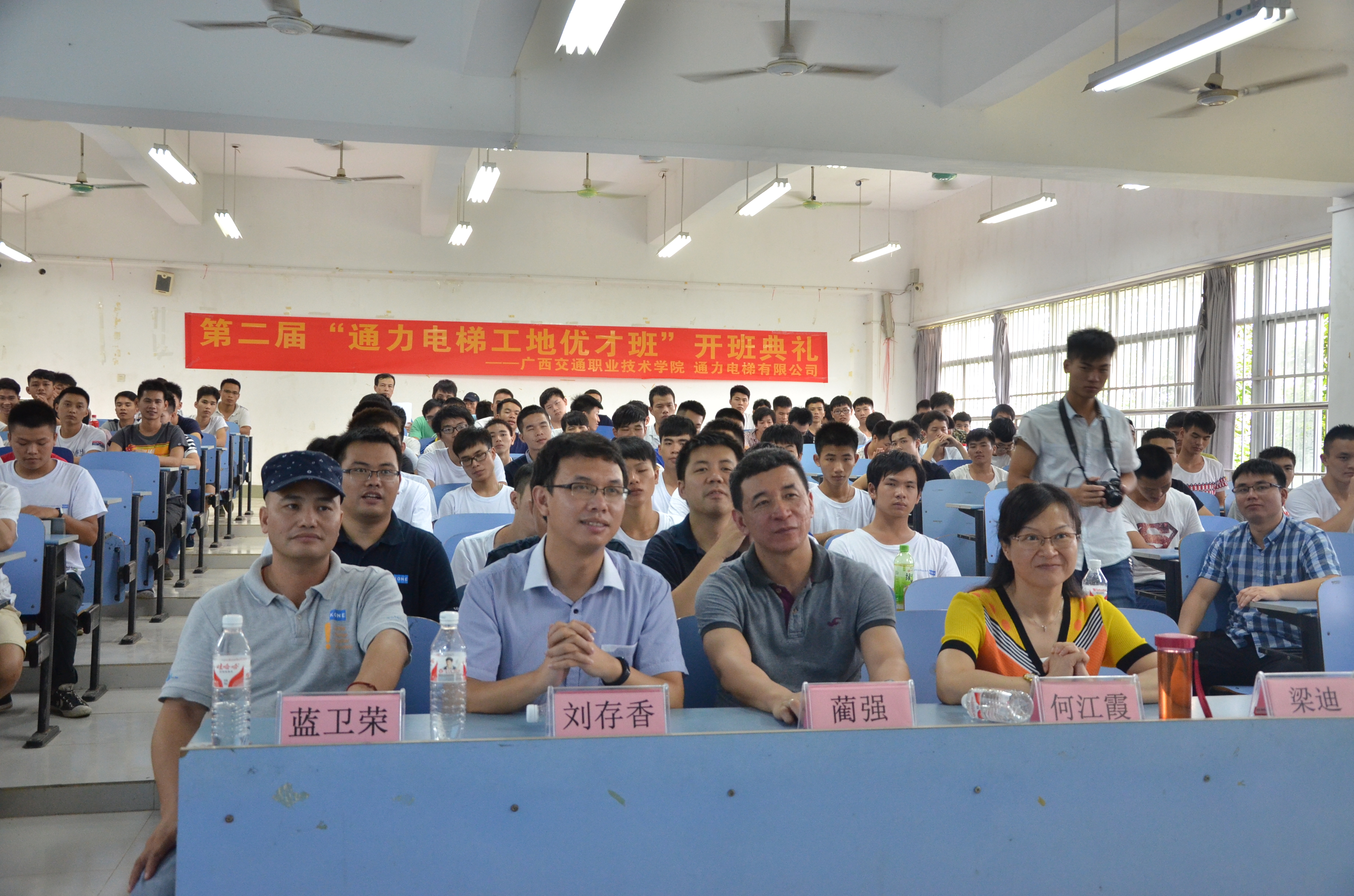 (汽车工程系 讯 林明松文 覃晓涓/图)9月6日下午,在我院四塘校区隆重举行了第二届“通力电梯工地优才班”开班典礼。通力电梯有限公司华南区域人事行政经理梁迪女士、南宁分公司经理蔺强先生,以及学院招生就业处何江霞处长、汽车系刘存香主任等领导出席了开班仪式。