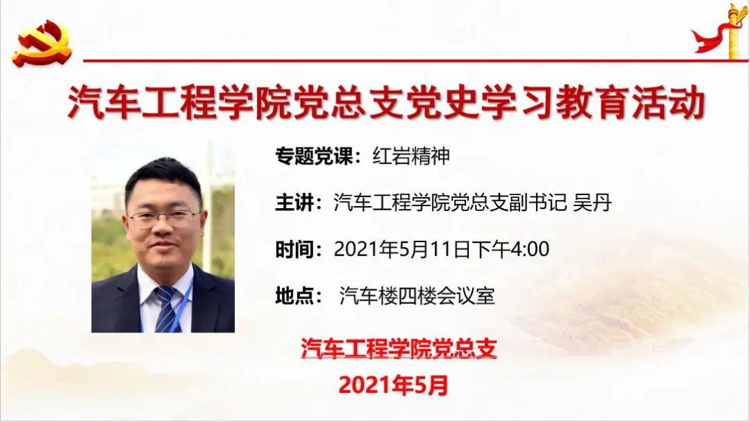 (汽车工程学院 讯 梁业灿、韦皓、王杰身/文、图)为了深入学习贯彻党史学习教育动员大会精神,落实党史学习教育系列学习活动。2021年5月11日,在汽车楼四楼会议室汽车工程学院党总支举行了《红岩精神》党史专题党课。本次党课由党总支副书记吴丹主讲,党总支书记刘学军、组织部副部长梁科以及全体教师党员参加。