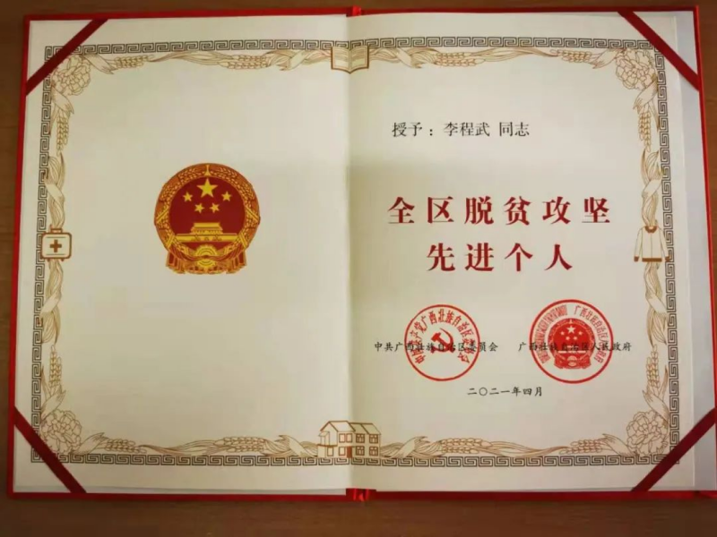 (汽车工程学院 讯 梁业灿、韦皓/文、图)为充分发挥先进典型示范引领作用,大力弘扬脱贫攻坚精神,广西壮族自治区党委、自治区人民政府决定,授予南宁市教育局等900个集体“全区脱贫攻坚先进集体”称号,授予曾祥彩等1200名同志“全区脱贫攻坚先进个人”称号。我院教师李程武荣获“全区脱贫攻坚先进个人”称号。