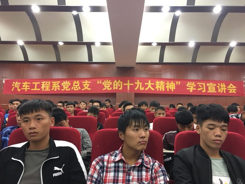 陈海峰副院长围绕党的十九大精神的会议主题、议程和重大意义、习近平新时代中国特色社会主义思想和基本方略等方面内容进行深入讲解。围绕新时代,新思想,新目标,新征程等方面展开,陈副院长用通俗的语言、生动的事例、详实的数据为汽车工程系师生做党的十九大精神宣讲报告。