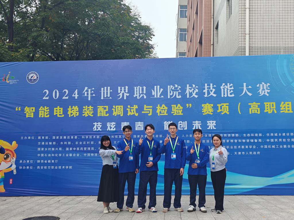(梁业灿/ 文 黄莲花/图)10月31日,从陕西西安传来喜讯,2024年世界职业院校技能大赛争夺赛(高职组)智能电梯装配调试与检验赛项圆满落幕,由我院黄莲花、张浩雨指导张铭葳、银玮、黄家健、谭绵浩组成的参赛队,与来自全国58支职业院校代表队激烈角逐,凭借扎实的专业素养、优异的现场表现,斩获该项目金奖。是继2022年首获全国一等奖后,第二次摘得一等奖(金奖)。