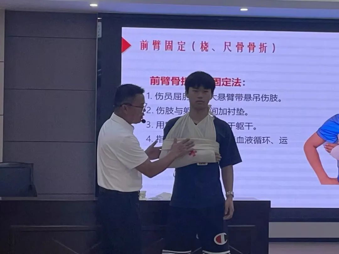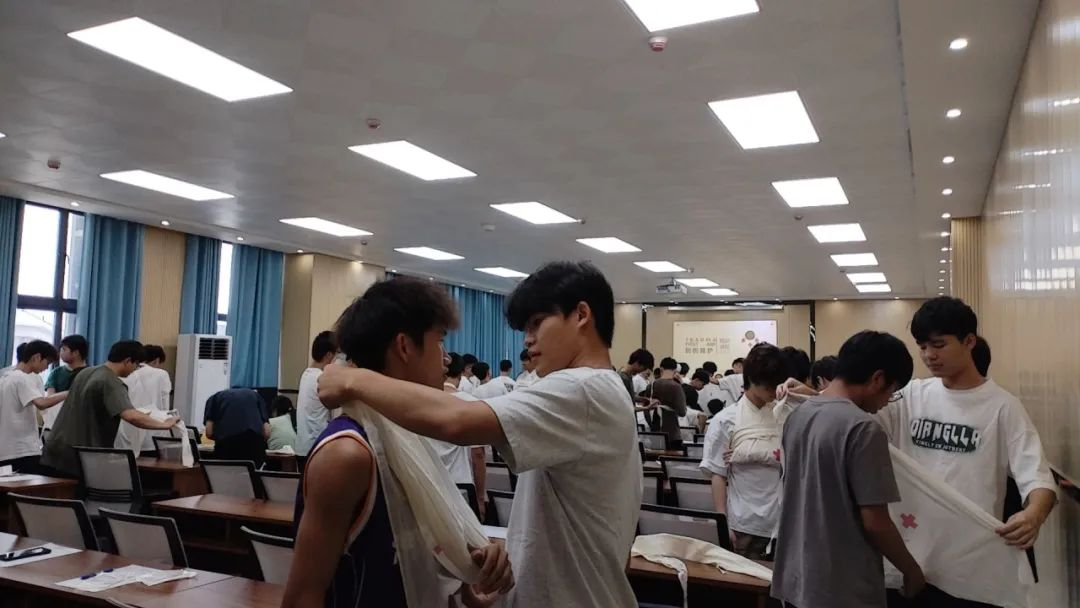 为提高培训质量,培训教师组织师生两两分组现场实操,手把手教学。大家认真学习如何使用三角巾、绷带等进行伤口包扎,运用止血带实施有效止血,利用夹板固定骨折部位,处理特殊创伤的规范操作等内容。培训讲师全程指导,严格把关每个操作细节,确保参训师生都能掌握创伤救护技能。