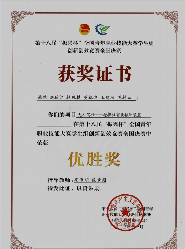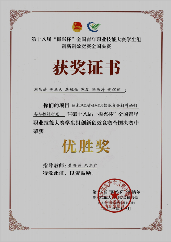 参赛作品中,由我校路桥工程学院黄贤智、黄君老师指导,覃佳松、李小玲等4位同学组建团队提交的参赛项目《人行道综合管廊——让道路远离“伤痕”》、由黄世源、朱志广老师指导,刘尚进、黄本天等6位同学组建团队提交的参赛项目《纳米SiO2增强A356铝基复合材料的制备与性能研究》以及由汽车工程学院梁海明、殷梦闯老师指导,梁铭、刘德江等6位同学组建团队提交的参赛项目《无人驾驶——挖掘机智能控制装置》荣获第十八届“振兴杯”全国决赛优胜奖。