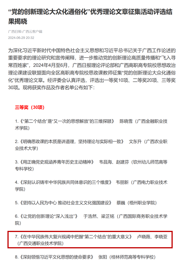 (马克思主义学院 讯 苏喜婷/文)近期,广西日报理论评论部和广西高职高专院校思想政治理论课建设联盟面向全区高职高专院校思政课教师征集“党的创新理论大众化通俗化”优秀理论文章征集活动评选结果揭晓,学校马克思主义学院卢晓薇、李晓亚老师的作品荣获三等奖。