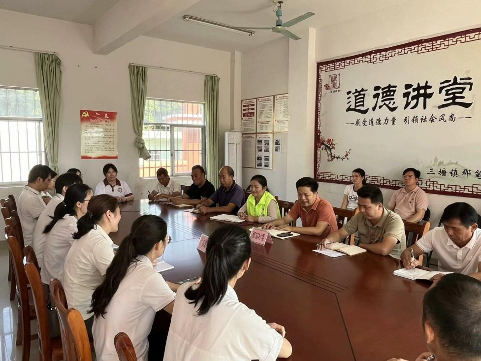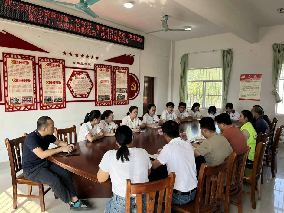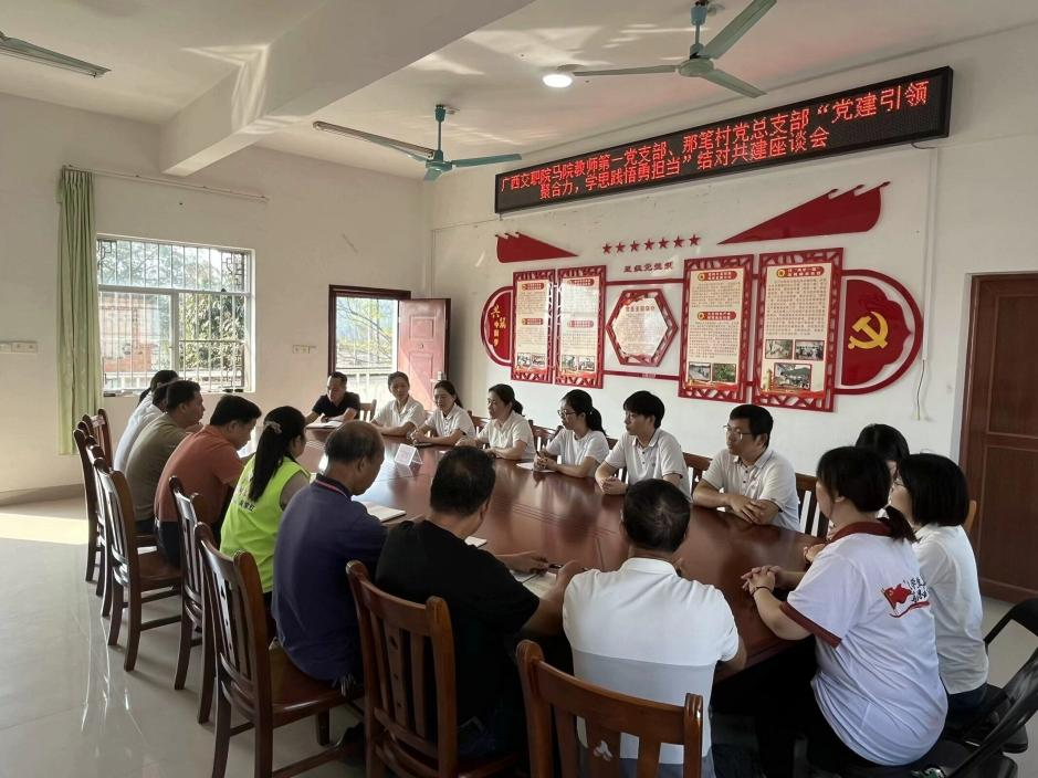 在兴宁区那笔村党员活动室,马克思主义学院教师第一党支部党员与那笔村村委及驻村工作队员进行了座谈活动。马克思主义学院党总支书记、教师第一党支部书记周黎华详细介绍了学校的相关情况,包括学校的办学历史、学科特色、师资力量以及近年来取得的科研成果和社会服务成就。她特别强调了学校在人才培养方面的理念和实践,以及学校在推动地方经济社会发展方面所做出的贡献。那笔村党总支部书记梁恒任热情欢迎学校党支部的到来,并简明扼要地介绍了那笔村目前的现状以及未来的发展方向。