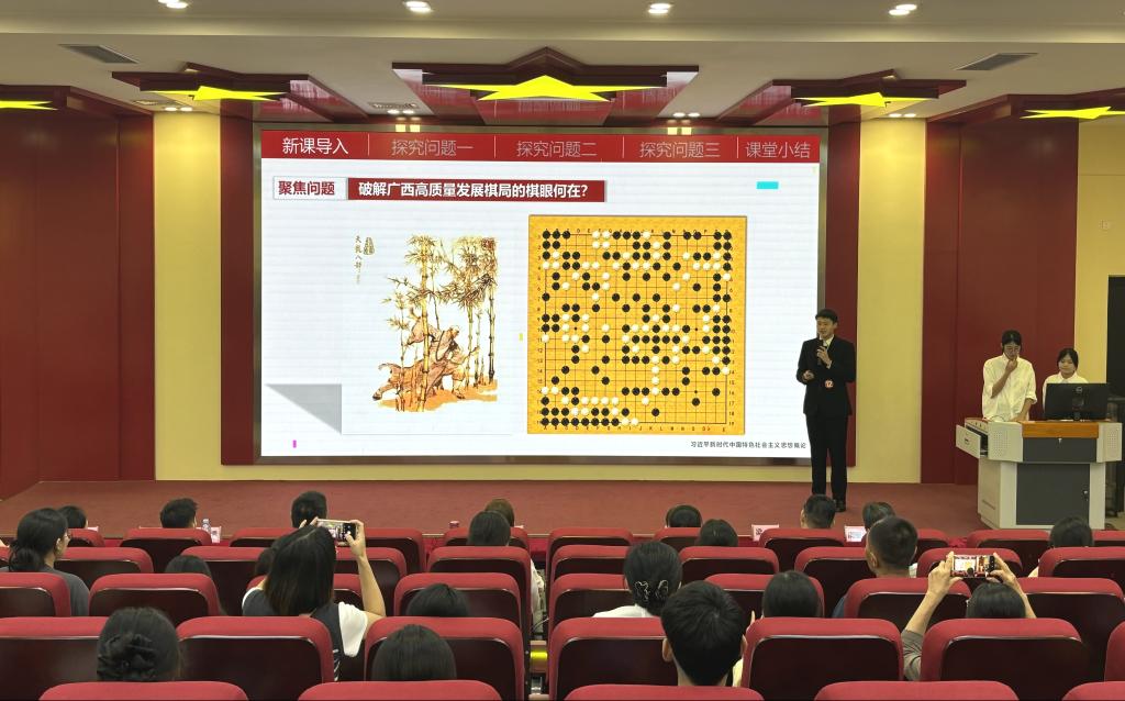 经过初赛选拔,共有22个参赛团队脱颖而出,其中12个参赛团队进入决赛。在决赛现场,12个参赛团队选手紧紧围绕“以青春之我 建壮美广西”主题,选取思想政治理论课教材相关章节,聚焦八桂大地的经济发展、科技产业、人文历史、生态环境等方面内容进行教学设计,运用视频、音频、AI角色演绎等丰富多样的方式,展现了青年学子投身壮美广西建设的炽热情怀与责任担当意识。经过激烈角逐,《以水为媒,铸牢中华民族共同体意识》等5个参赛团队作品荣获一等奖,《广西如何做活扩大开放这个“棋眼”?——坚定不移扩大高水平对外开放》等7个参赛团队作品荣获二等奖,《从平陆运河看“两山论”的三重生态智慧》等10个参赛团队作品荣获三等奖。