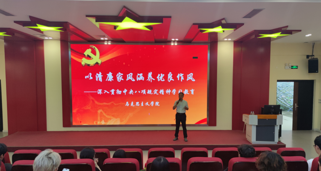 马克思主义学院教师第三党支部副书记杨中陶做了“以清廉家风涵养优良作风”的主题宣讲,以习近平总书记围绕注重家庭、注重家教、注重家风建设作出的一系列重要论述为主线,结合正反两方面的案例进行剖析,诠释了对于领导干部来说,家风不是个人小事、家庭私事,而是作风的重要表现,是党风政风、社风民风的重要基石。