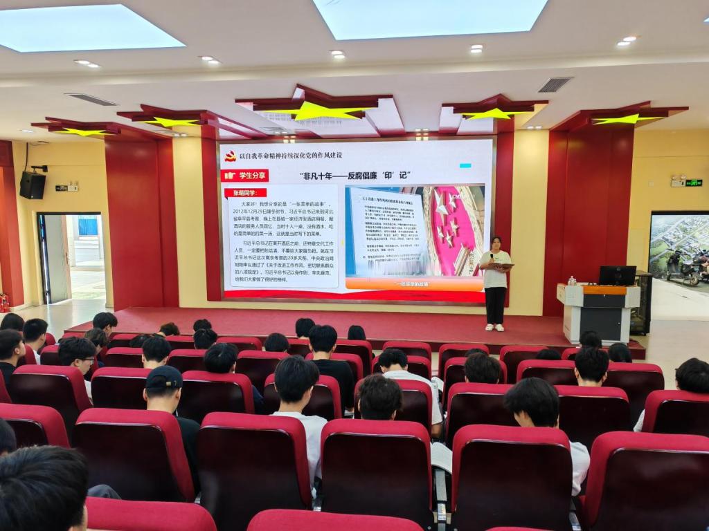 在这场宣讲中,马克思主义学院朱青穗老师以学习领会习近平总书记关于深入贯彻中央八项规定精神学习教育的重要讲话和重要指示精神为切入点,以自我革命精神持续深化党的作风建设”为题,从“为什么说反腐败是最彻底的自我革命?党的自我革命为何与人民群众息息相关?党的自我革命为何永远在路上?”三个维度详细诠释以习近平同志为核心的党中央在带领全党推进全面从严治党的历史进程中,深刻回答管党治党、兴党强党时代答卷,开辟了百年大党自我革命的新境界。汽车工程学院张萌同学在“非凡十年——反腐倡廉‘印’记”分享活动中,从“一张菜单的故事”入手,讲述党的十八大以来,中央八项规定如何整治痼疾、扫除积弊,成为百姓交口称赞的作风建设“金色名片”,进一步说明先进的马克思主义政党不是天生的,而是在不断自我革命中淬炼而成的。