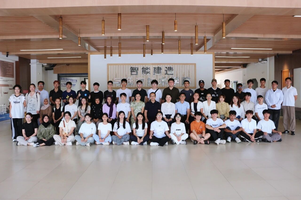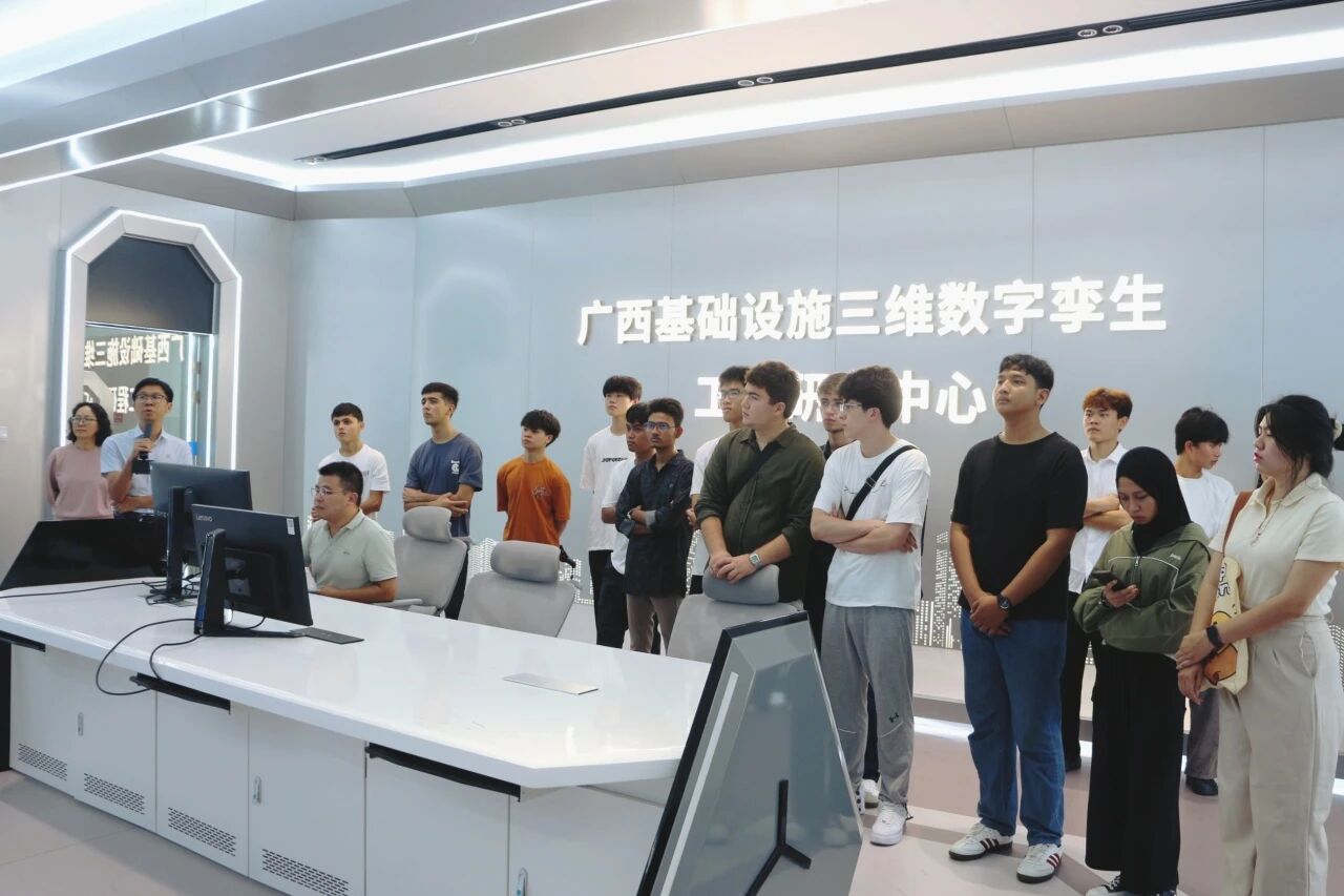 活动伊始,中外学子分组参观了交旅文创坊与广西基础设施三维数字孪生工程研究中心,在李晓童、梁承龙和彭来等专业教师的讲解下,学生们不仅欣赏了传统非遗文创作品的匠心之美,更通过数字孪生平台的动态演示,直观感受到智能建造、智慧工地与低空技术在现代工程中的创新应用。传统工艺与前沿科技在此交融,为非遗文化注入了新时代的活力。