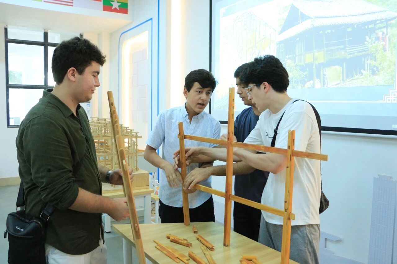 在国际学生文化交流基地,李晓童老师以侗族鼓楼为例,深入浅出地讲解中国传统木构建筑中的榫卯技艺。通过侗族鼓楼营造动画视频与实物模型展示,抽象的结构原理变得生动可感。并邀请中外学生分组协作,亲手尝试侗族木构“一品梁架”的拼接,在一拼一接间领略“不用一钉一铆”的营造智慧,现场互动热烈,惊叹声与欢笑声不绝于耳。