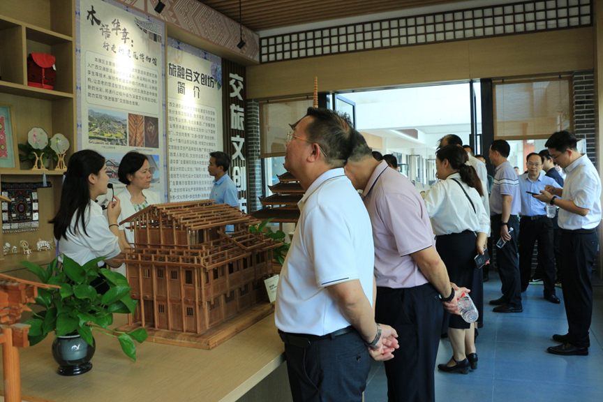 首先,观摩组一行参观了我院的交旅文创坊,该文创坊是学院主动适应交通与旅游融合发展的新趋势,携手广西旅发科技股份有限公司等企业共同打造的集行业科普、非遗体验与文创研发于一体的实践育人空间。在文创坊,由我院交旅融合智慧园林教学团队指导学生完成的“梅、兰、竹、菊”廉洁主题花艺作品令与会代表们印象深刻。他们对专业教学团队将日常技能训练与廉洁文化浸润有机结合,引导学生“树清廉之心、行清廉之事、做清廉之人”的做法表示赞许。现场陈列的廉洁主题壮锦纹样的布袋、清廉公约书签等文创作品也吸引了众多代表驻足流连。