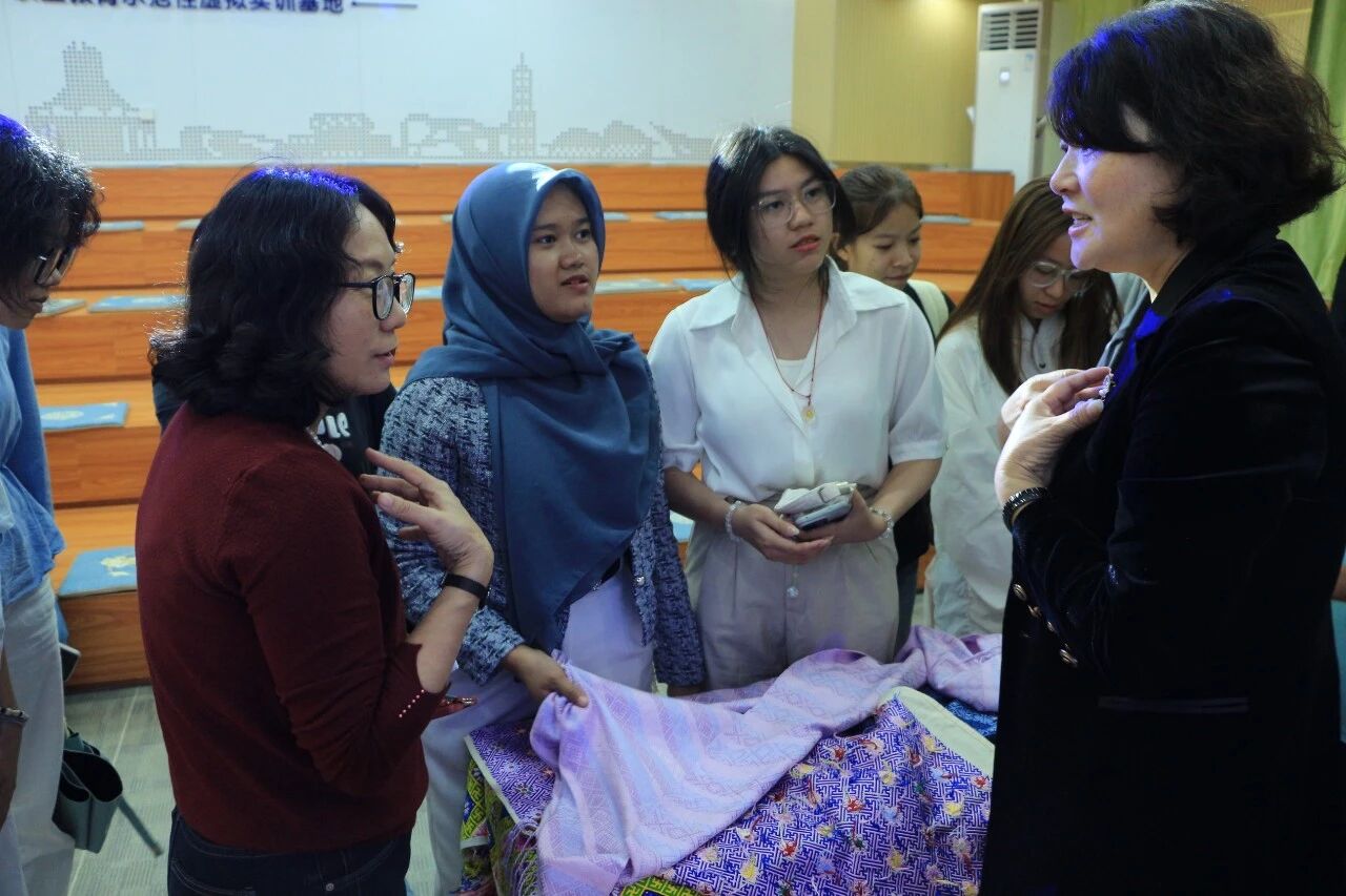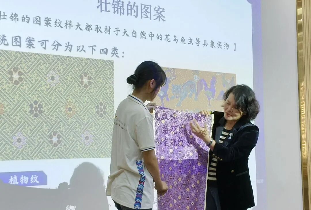讲座现场气氛热烈,留学生们对壮锦独特的纹样和编织技艺表现出浓厚兴趣,踊跃提问。同学们从技术视角,对壮锦图案的数字化应用、与现代设计结合的可能性展开了思考。不同文化背景、不同专业领域的思维在此刻交融,为非遗的活化传承注入了新的灵感。