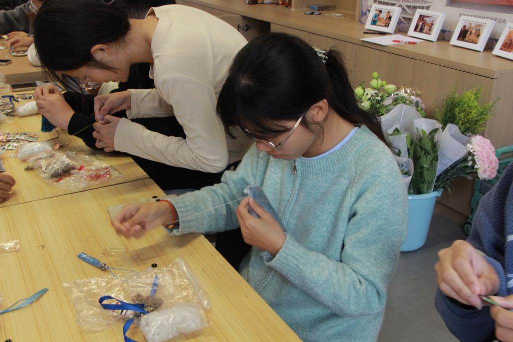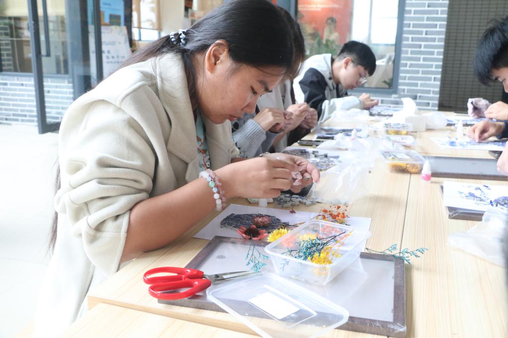活动紧扣“非遗活化”与“清正廉洁”主线,设置了六大特色项目。在“非遗匠心·‘守正’致美”文创设计展区,同学们从交通符号、传统纹样中汲取灵感,设计制作蕴含廉意的墨师文书签、U型枕等文创品;在“清风拂面·以花喻廉”花艺赛场,师生以花材为笔,抒写对“清正廉洁”的品格追求;侗族木构建筑营造技艺体验让“无规矩不成方圆”的哲理在榫卯拼接中变得真切可感;植物香囊制作区药香清逸,引导师生体悟“正气存内,邪不可干”;壮锦铜鼓挂件制作将民族纹样与廉洁寓意结合,一丝一线编织“一丝不苟、正气凛然”的华章;青花瓷干花拼贴活动则以定格的艺术形式,寓意高尚品格历久弥新。
